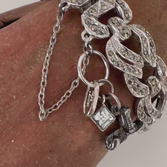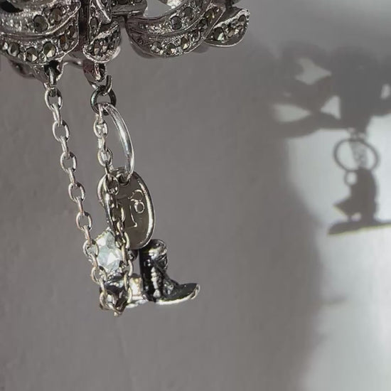 This one-of-a-kind curated charm bracelet, is perfect for party season or to elevate everyday dressing. The unique bracelet is encrusted with tiny grey faceted gemstones which create a subtle shimmer. Vintage charms include a sphinx and a diamond shaped encased gem. Finished with a Regilt tab.