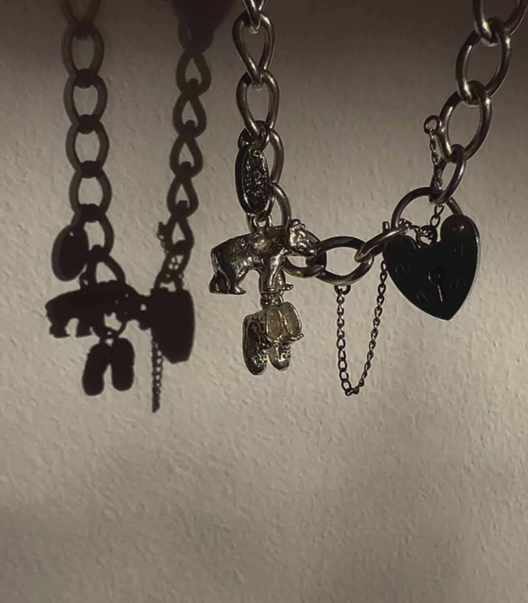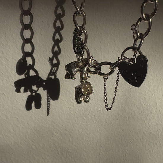 One-of-a-kind bracelet with a curation of vintage charms. This timeless sterling silver charm bracelet has the iconic heart lock fastening with safety chain. We have sourced two sterling silver charms from different eras - a bear and a pair of baby booties. A unique bracelet for any individual, this would make a lovely baby shower gift or new baby gift for a treasured mum. Regilt tab completes the look.