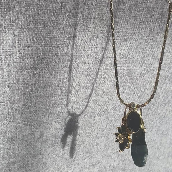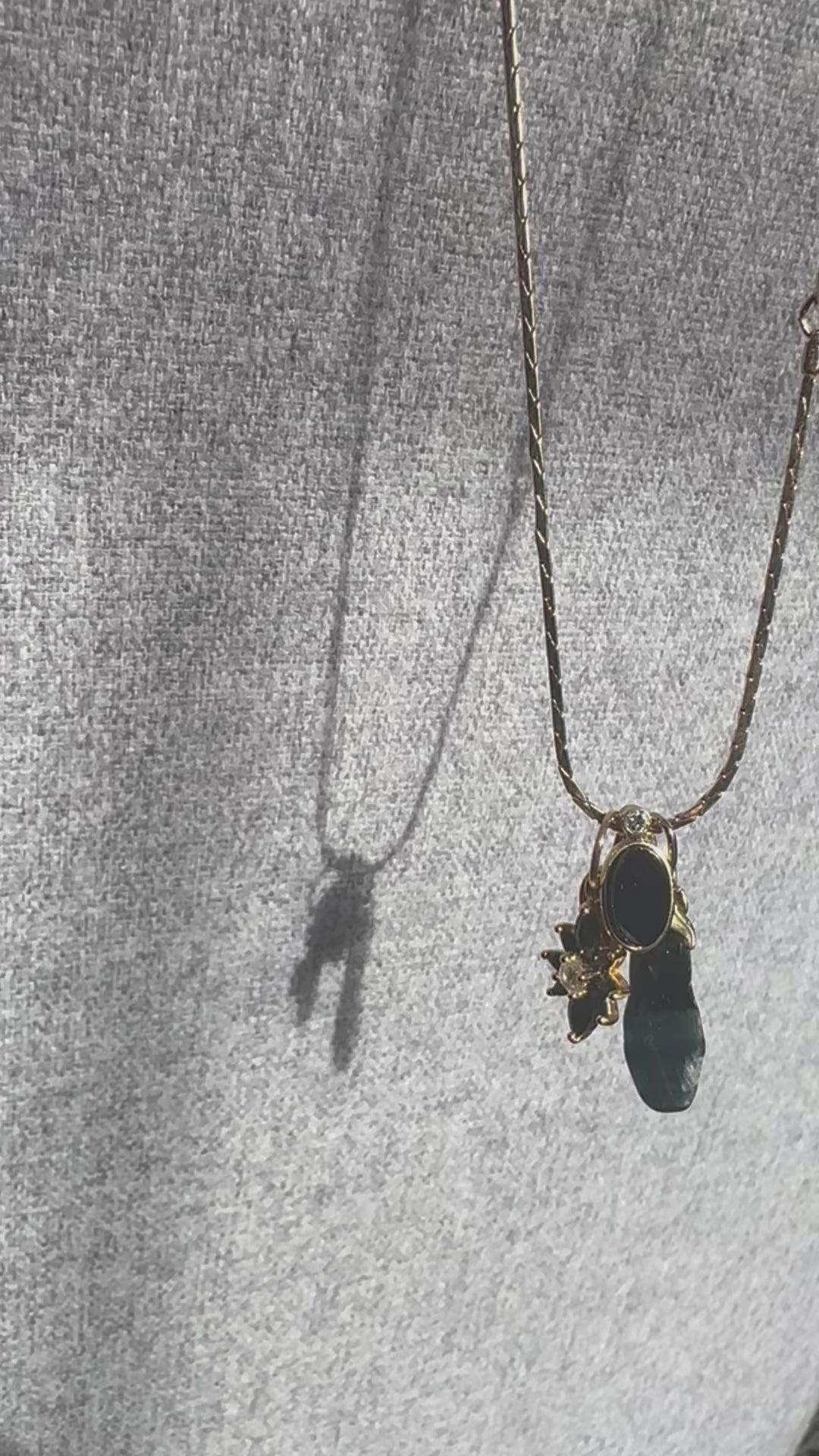 One-of-a-kind necklace showcasing a beautiful curation of vintage gems in classic black colourway.. Diamante and black facetted pendant sits between vintage gemstone and black and diamante flower charm. Finished with a Regilt tab.
