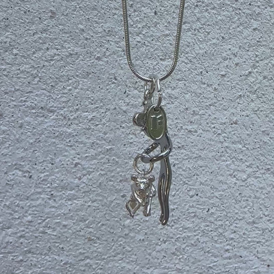 One-of-a-kind charm necklace made from a curation of vintage finds. This stamped sterling silver necklace is in a classic snake rope design which compliments contemporary wardrobes. A trio of charms include hugging figure, enamel bee and silver cupid bear with arrow and dangling heart. Finished with a Regilt tab.