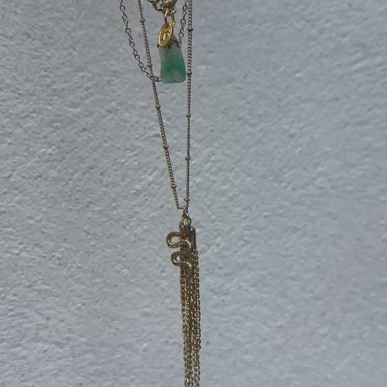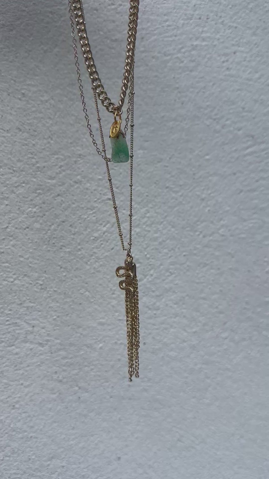 This layered necklace is a one-of-a-kind piece for that special someone. Triple chain design brings the stacked necklace trend in one including chunky chain with vintage gemstone, fine midi chain and longer link pattern chain with tassel and snake charms. Finished with a Regilt tab.