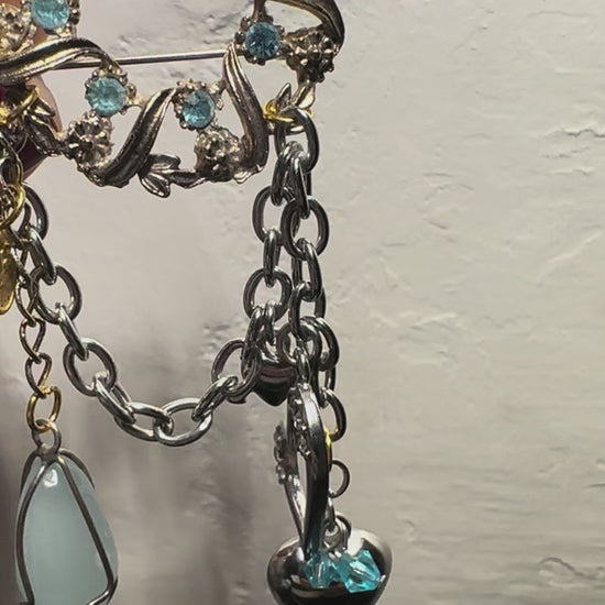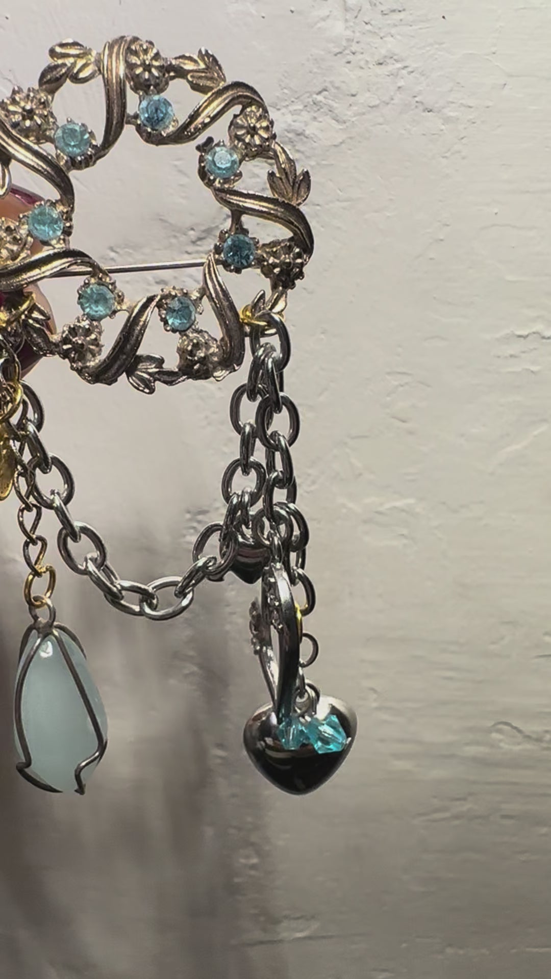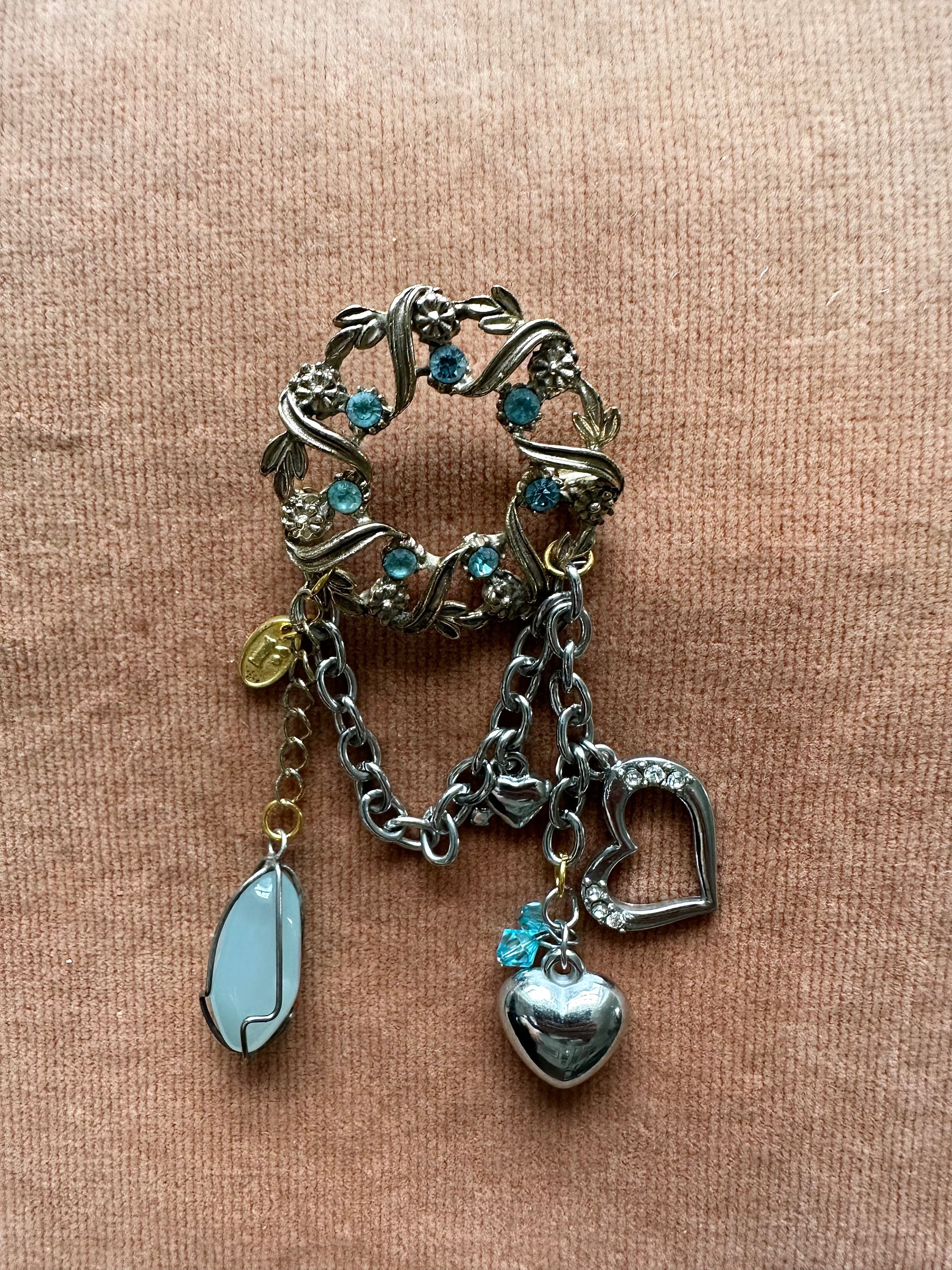 SOLD Vintage wreath design brooch with a one-of-a-kind charm curation in blue tones. Finished with a Regilt tab.