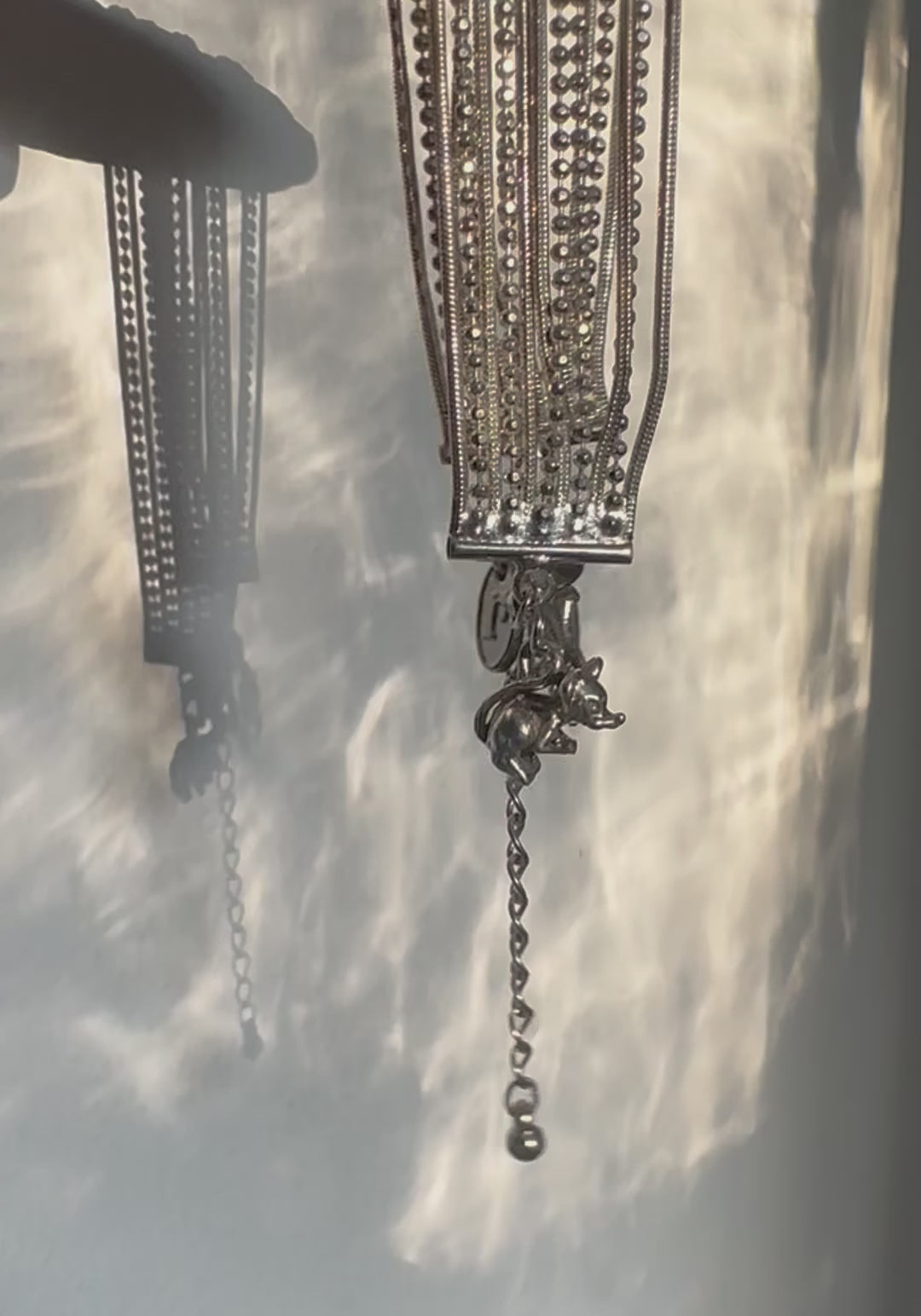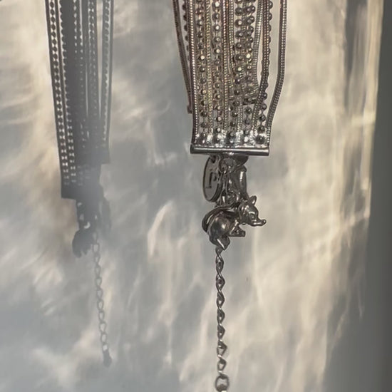 One-of-a-kind bracelet, a curation of vintage treasures. Silver bracelet has a succession of fine ball and plain chains which give a lovely drape across the wrist. lobster clasp and extender chain at either side are joined by two sterling silver charms- one cat, one mouse both have beautiful detailing reflective of their era. Regilt tab completes the look.