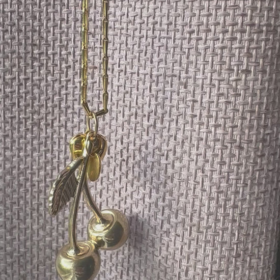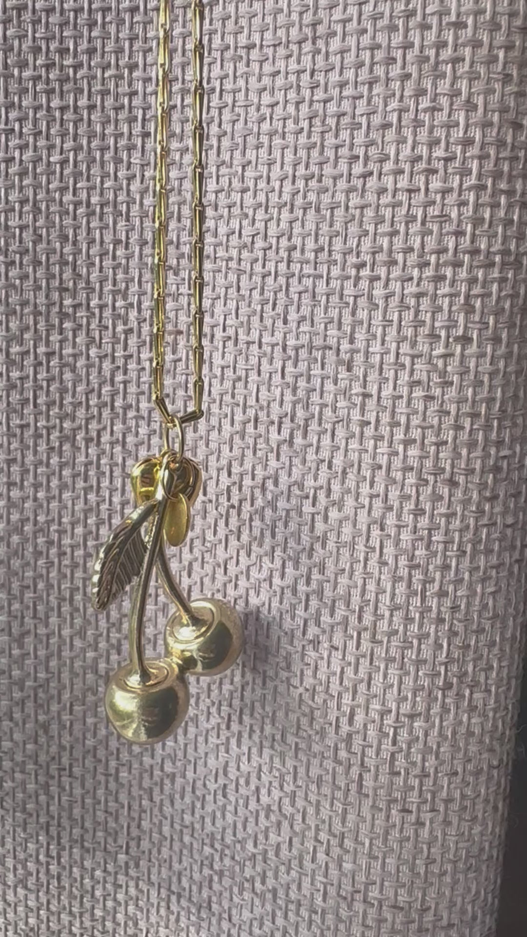 One-of-a-kind necklace with unique cherry pendant and charm combination. Longer length vintage chain with etched opening locket charm. The solid cherry pendant is a quality weight and gold plated. This necklace is part of this seasons Sweetest Picks range featuring the vintage cherry design, each one is unique. Regilt tab completes the look.