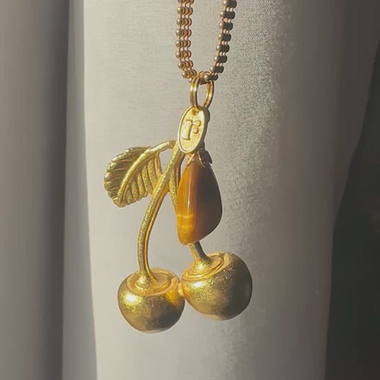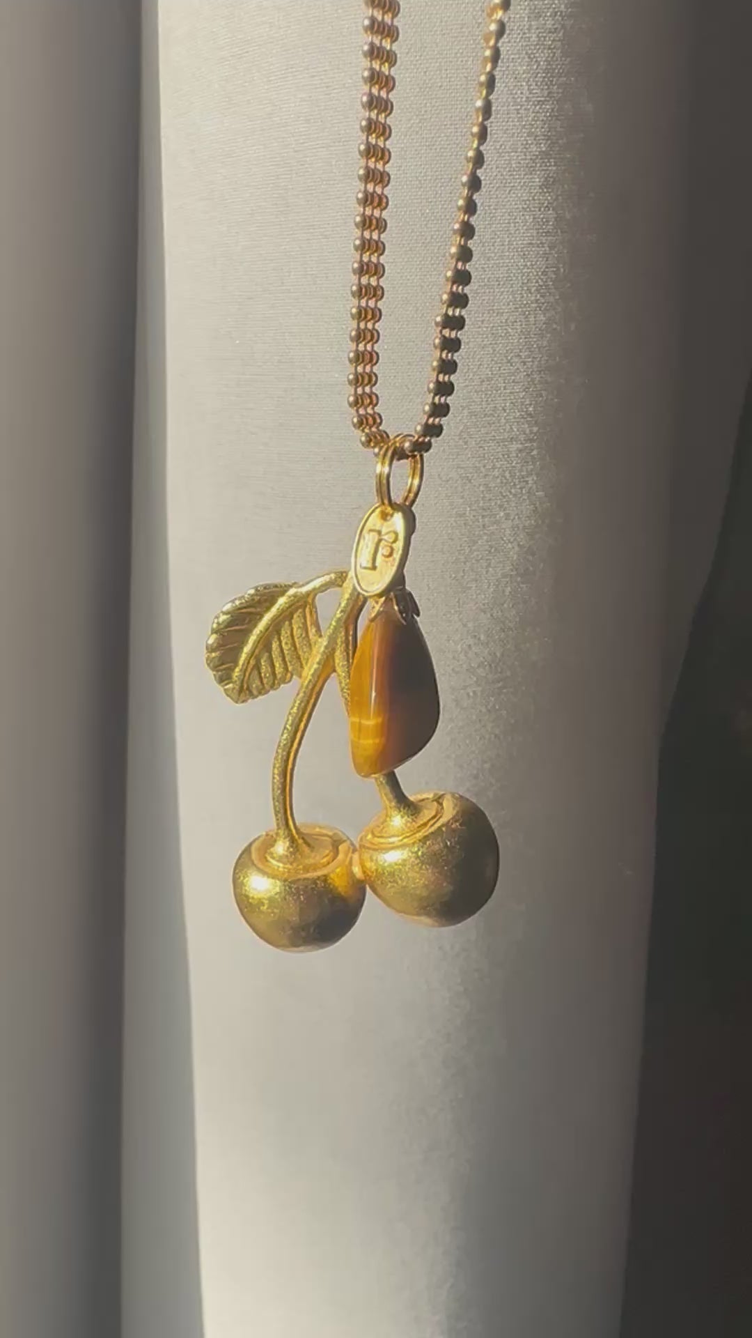 One of a kind necklace made from a long vintage chain and yellow gold tone weighty cherry pendant. Finished with a Regilt tab and vintage tigers eye charm. The longer length chain can be double wrapped for an alternative stacked look.