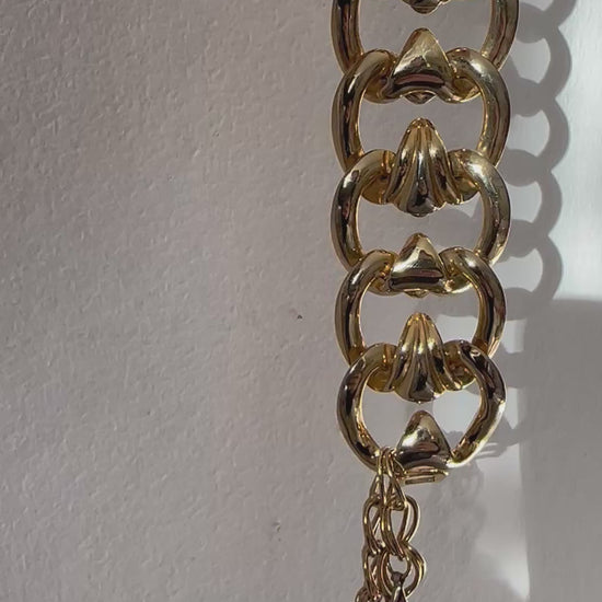 A unique piece with timeless style, this bracelet and charm curation brings a contemporary twist to 80’s design. The chunky links are joined by chain dangles and encased gemstone drops in burgundy tones. Finished with a Regilt tab.