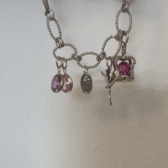 One-of-a-kind bracelet featuring a unique curation of pretty charms. The sterling silver bracelet has unusual twisted links which compliment the sourced charms. Three sterling silver charms include ballerina, crown with pinkish gem and St Christopher. Two faceted gems and Regilt tab complete the piece.