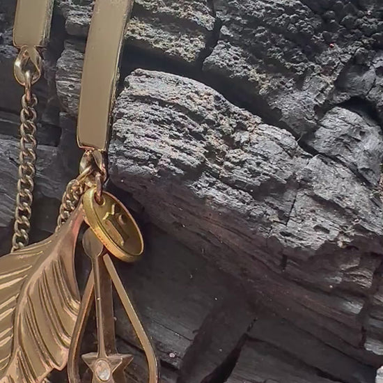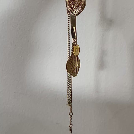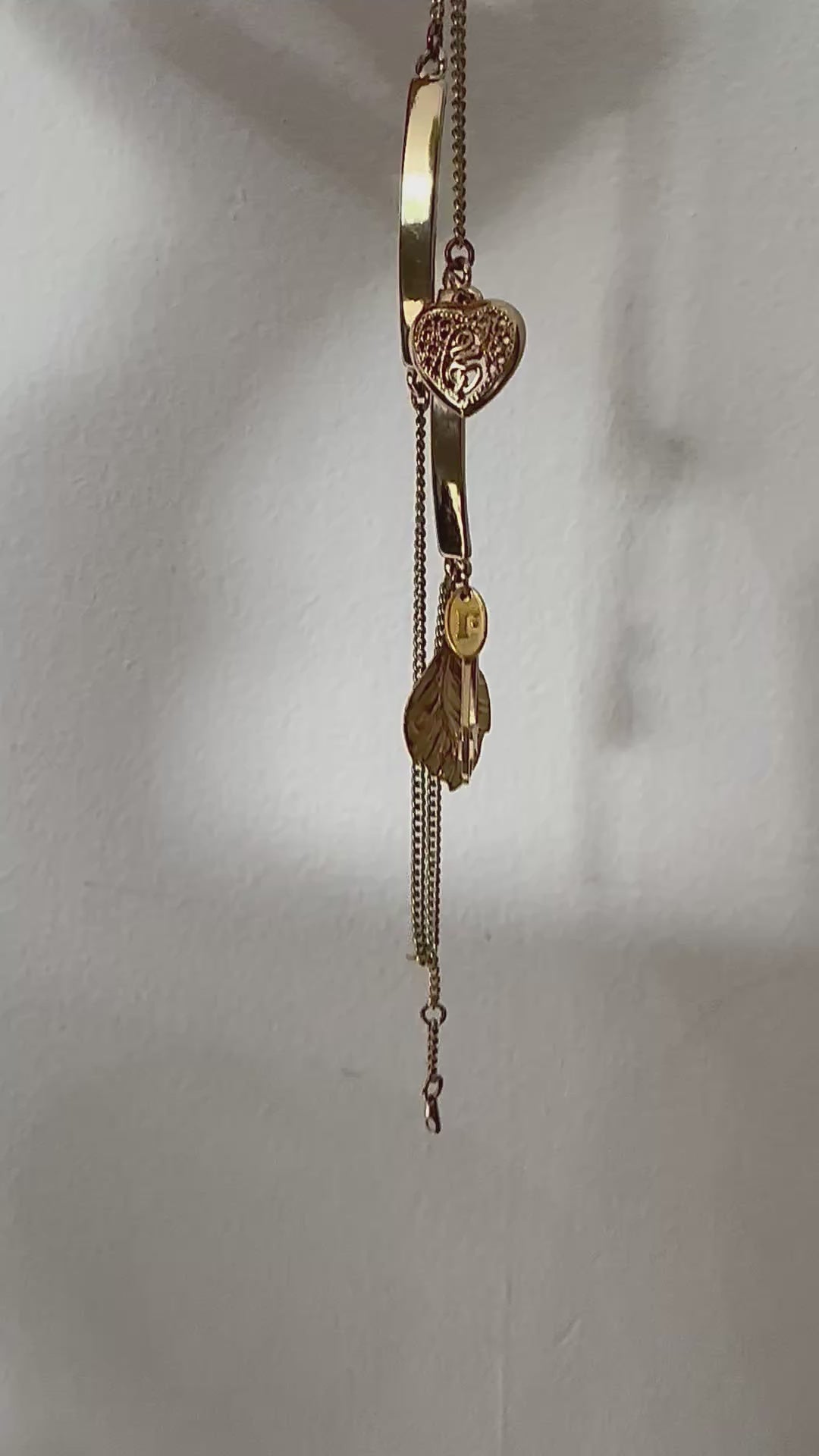A rare find, this vintage identity bracelet is a double design, to be left as is or engraved with your favourites. Siblings, friends, lovers, mothers…special dates or words with meaning. Trio of curated charms includes golden leaf, heart and gem star droplet. Finished with a Regilt Tab.