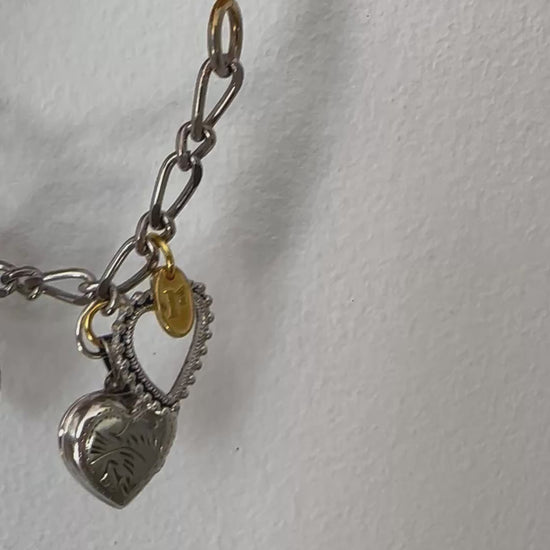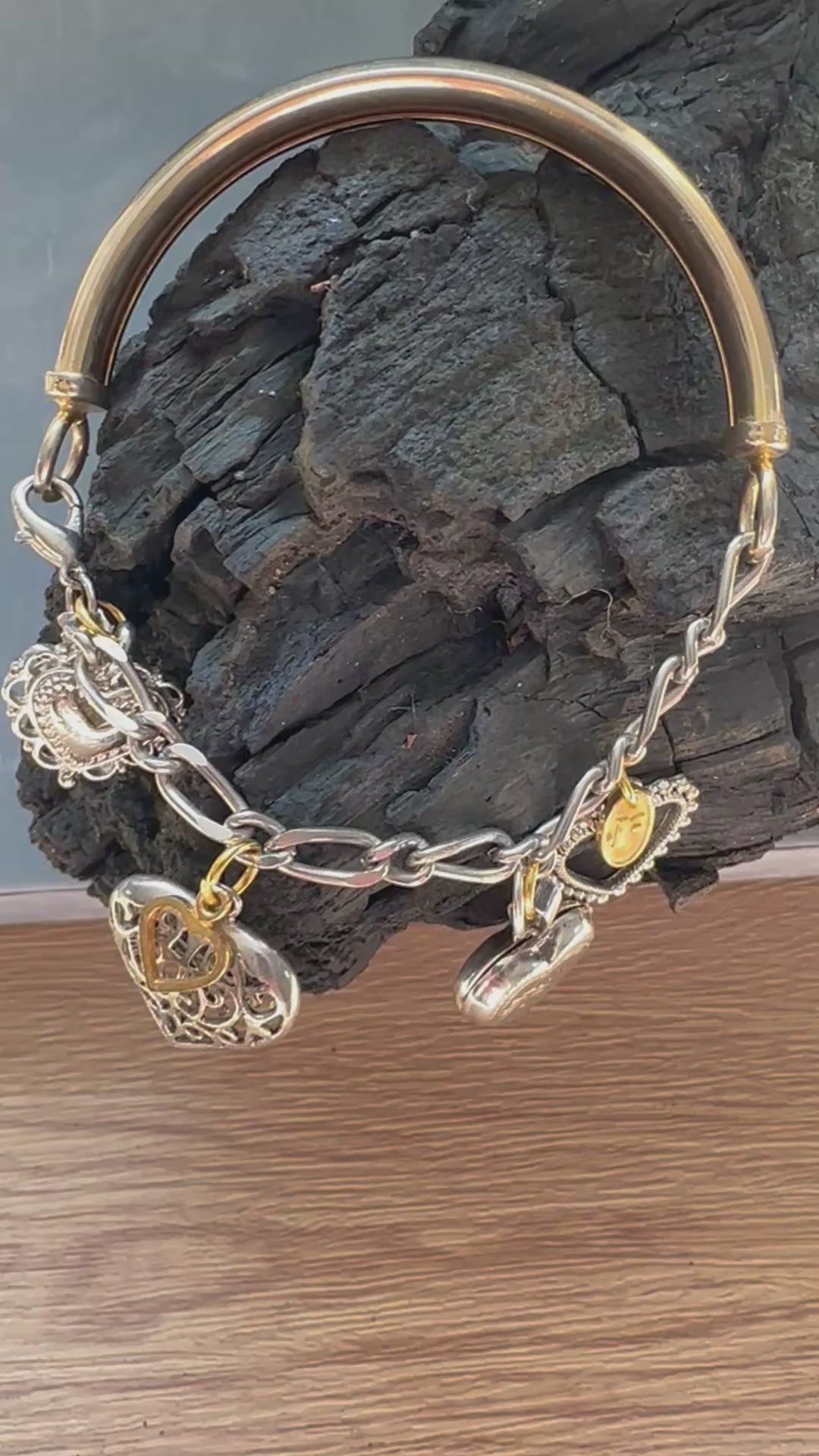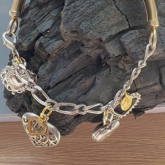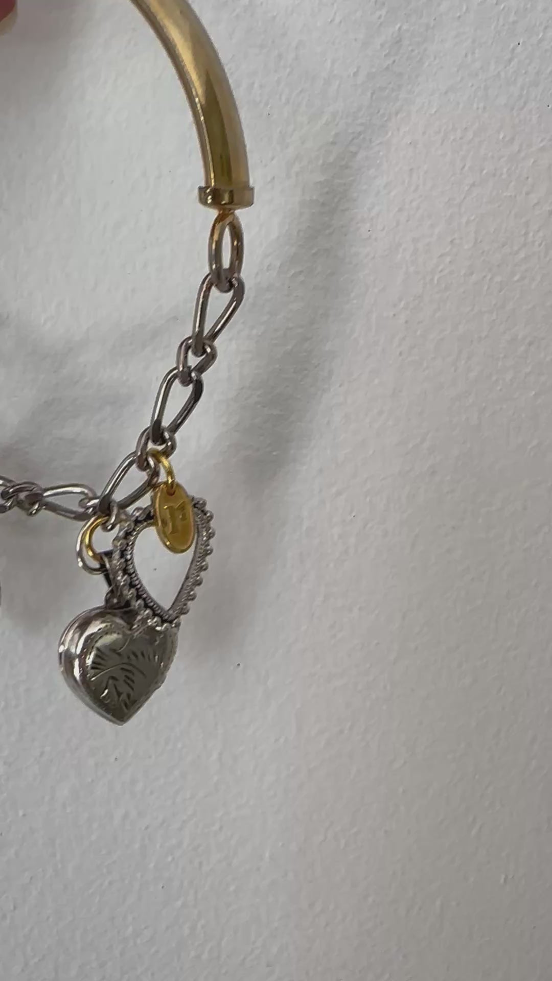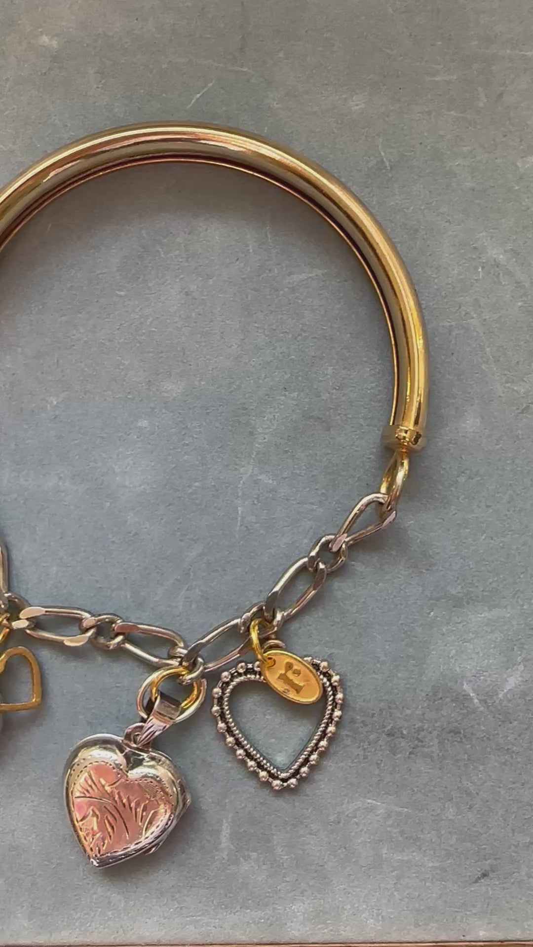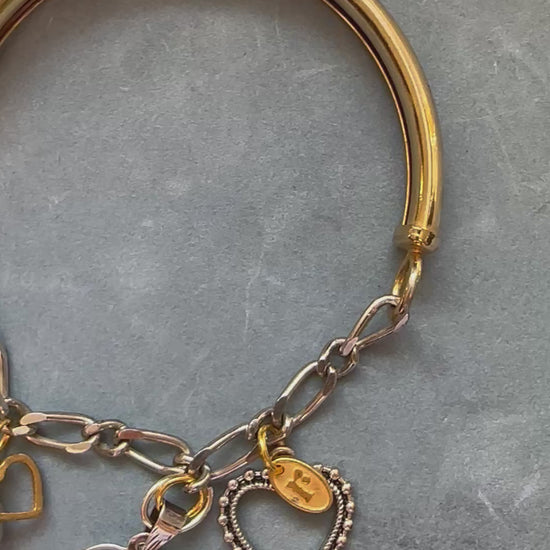 One-of-a-kind charm bracelet with a curation of vintage charms. The unique design is half golden bangle and half silver links on which the heart charms hang. Charms include opening sterling silver locket with etching to both sides, outline silver and gold hearts and filigree effect designs. Finished with a Regilt tab.