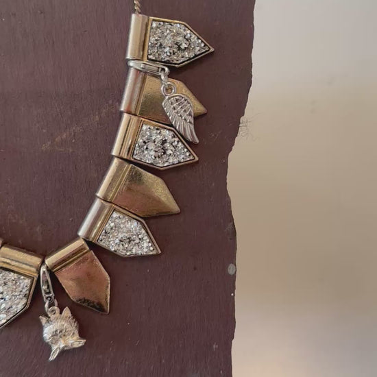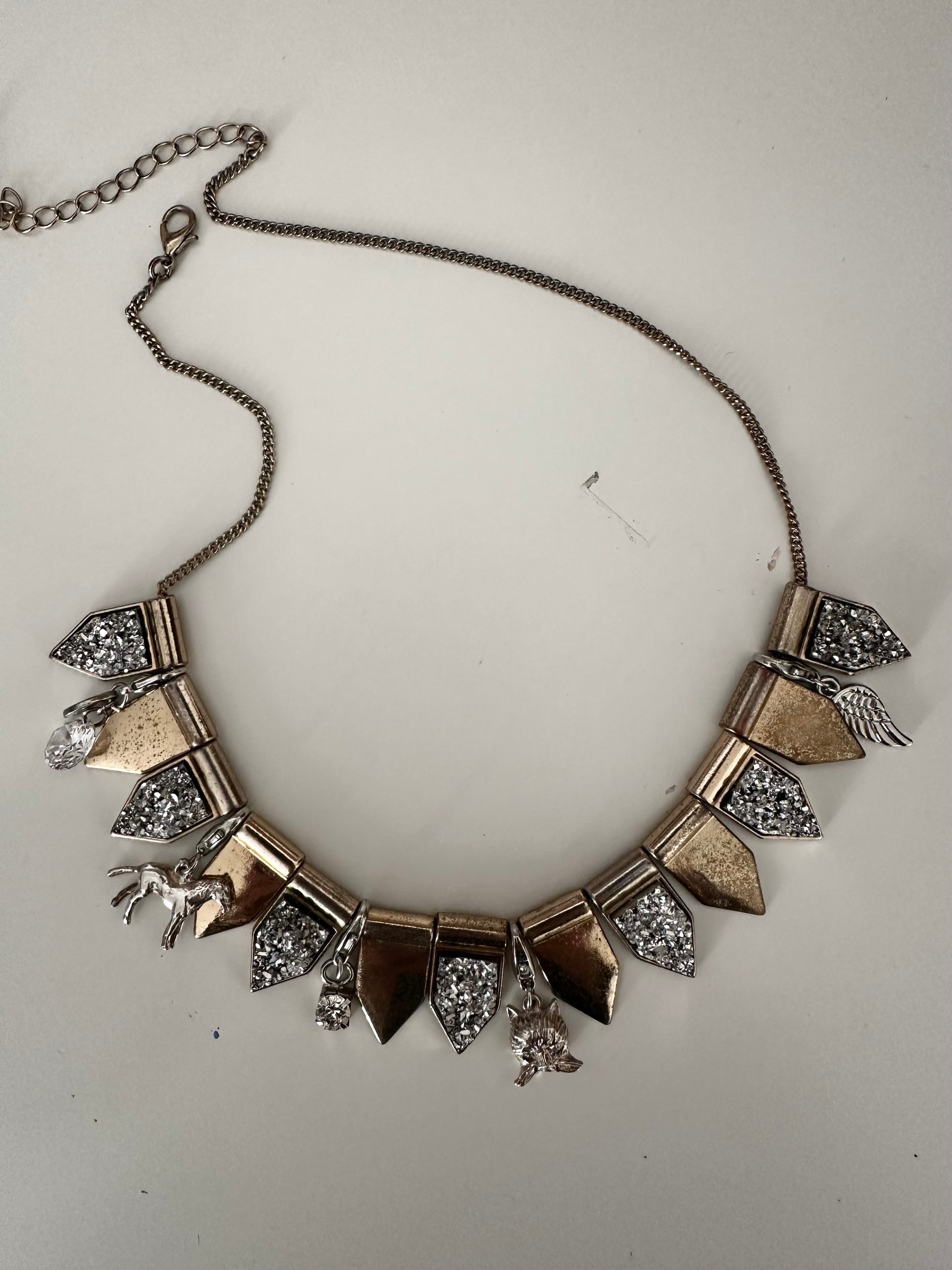 One-of-a-kind statement necklace made from a curation of vintage finds. This beautiful piece features alternating plain gold and silver encrusted gold flag pendants. Nestled between the flags are an array of vintage charms including sterling silver horse and cat head, an angels wing and a diamanté gem. Perfect for party season, or to add a unique touch to everyday dressing. Finished with a Regilt tab.