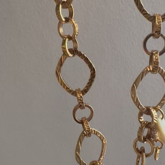 One-of-a-kind chunky link necklace with a curation of charms. This necklace is a unique piece suited to both casual and more dressy occasions. The hammered gold links are joined by a trio of mother of pearl nuggets, a filigree charm and a Regilt tab.