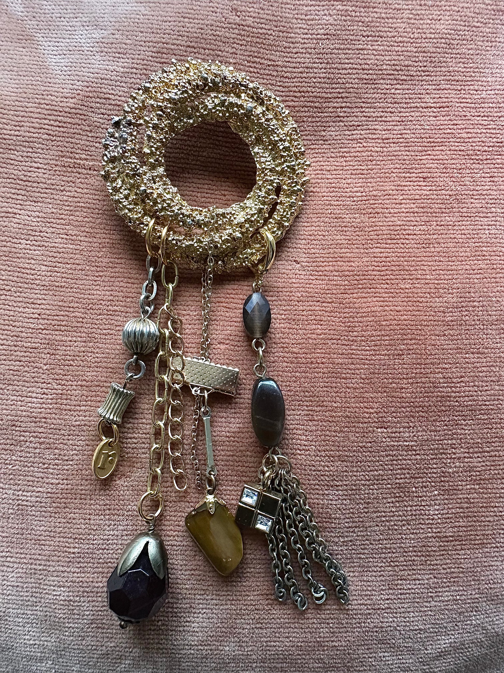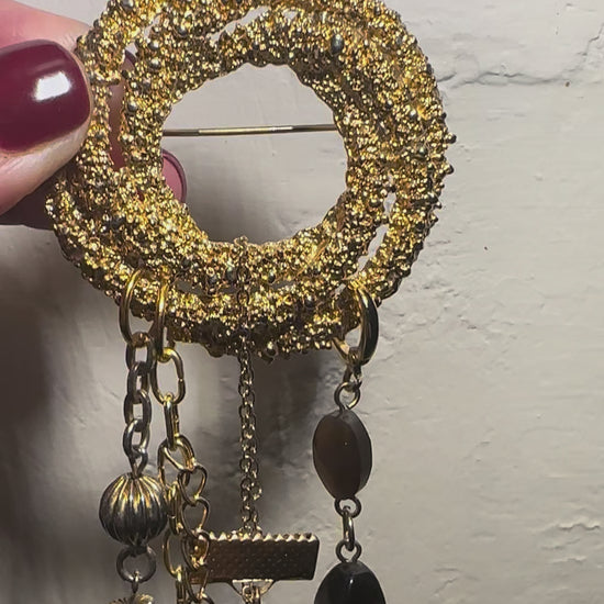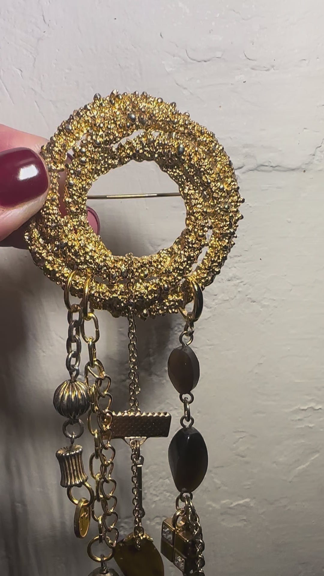 Vintage swirl brooch with a one-of-a-kind charm curation in brown tones. Finished with a Regilt tab.