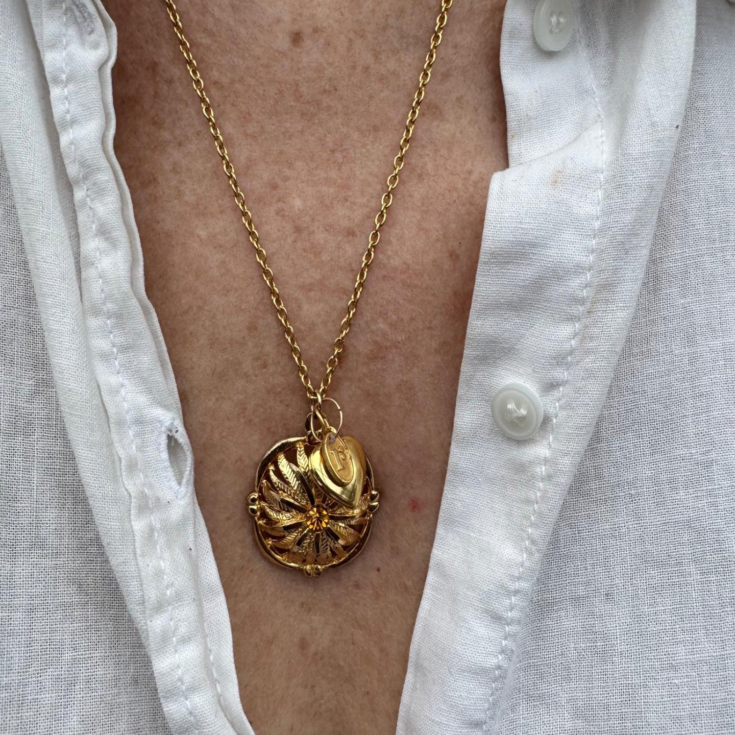 Part of our Endless Love collection, this yellow gold tone necklace is a unique piece for that special someone. A mid-century sunburst pendant with central gemstone is joined by a heart locket and Regilt fob. The small opening locket can hold two photographs of your forever favourties.
