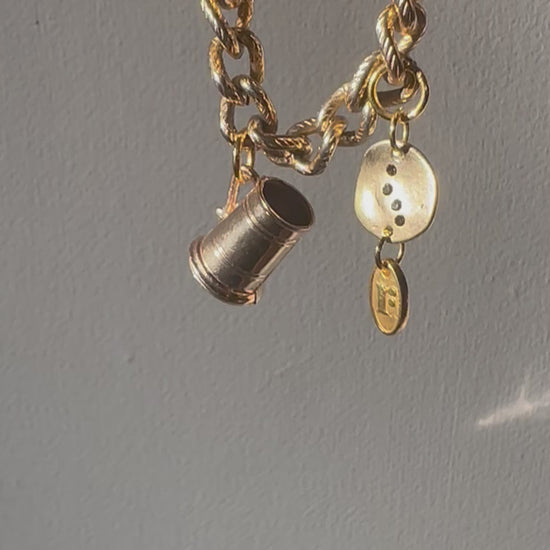 SOLD One-of-a-kind charm bracelet reimagined for contemporary looks. Chunky link design bracelet can be worn for both everyday and special occasions. Solid gold 9ct gold tankard charm has stamped hallmark and is perfect for saying cheers to special milestones and achievements, or thank you for being a friend. Drop link nugget charm with gem design attached to the Regilt tab.
