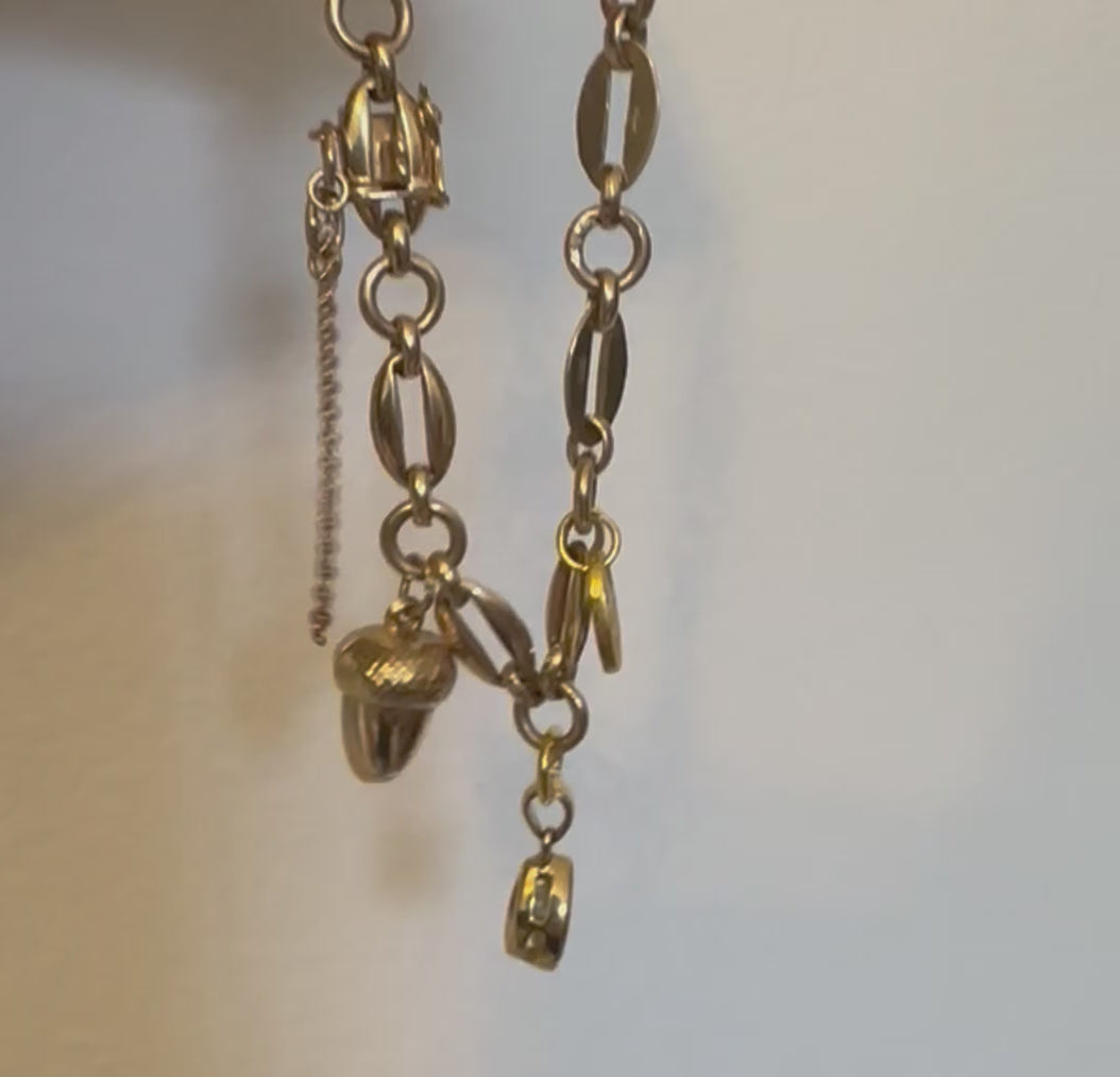 One-of-a-kind 9ct gold charm bracelet with a unique charm selection. This vintage charm bracelet has a stunning link design and each solid gold link has a hallmark. Pretty clasp fastening with safety chain also in 9ct gold. Charms include vintage encased clear gemstone, Regilt tab and 9ct gold hallmarked acorn. An heirloom piece to love and cherish for future generations.