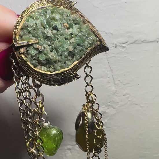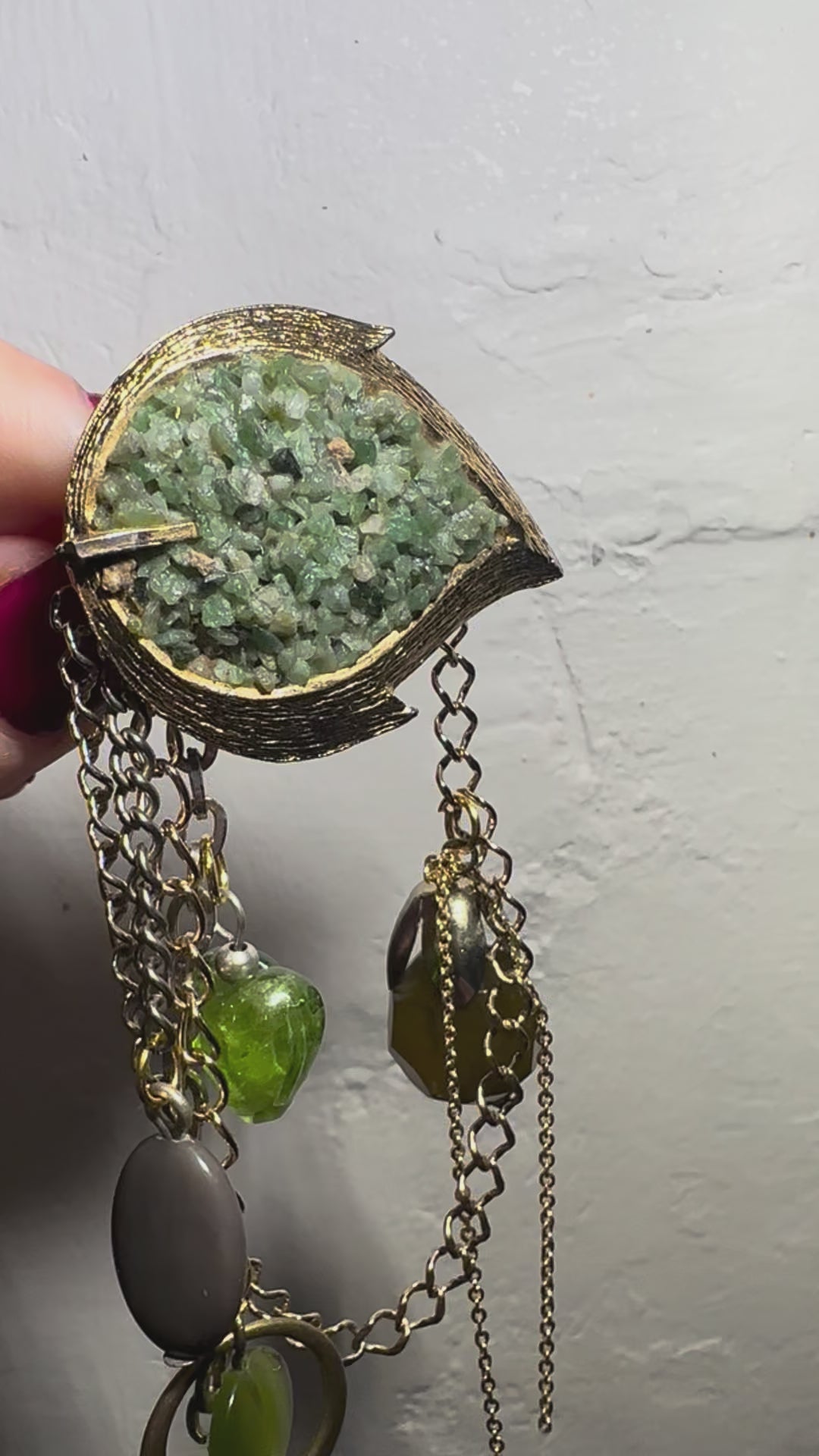 Vintage flower brooch with a one-of-a-kind charm curation in green tones. Finished with a Regilt tab.
