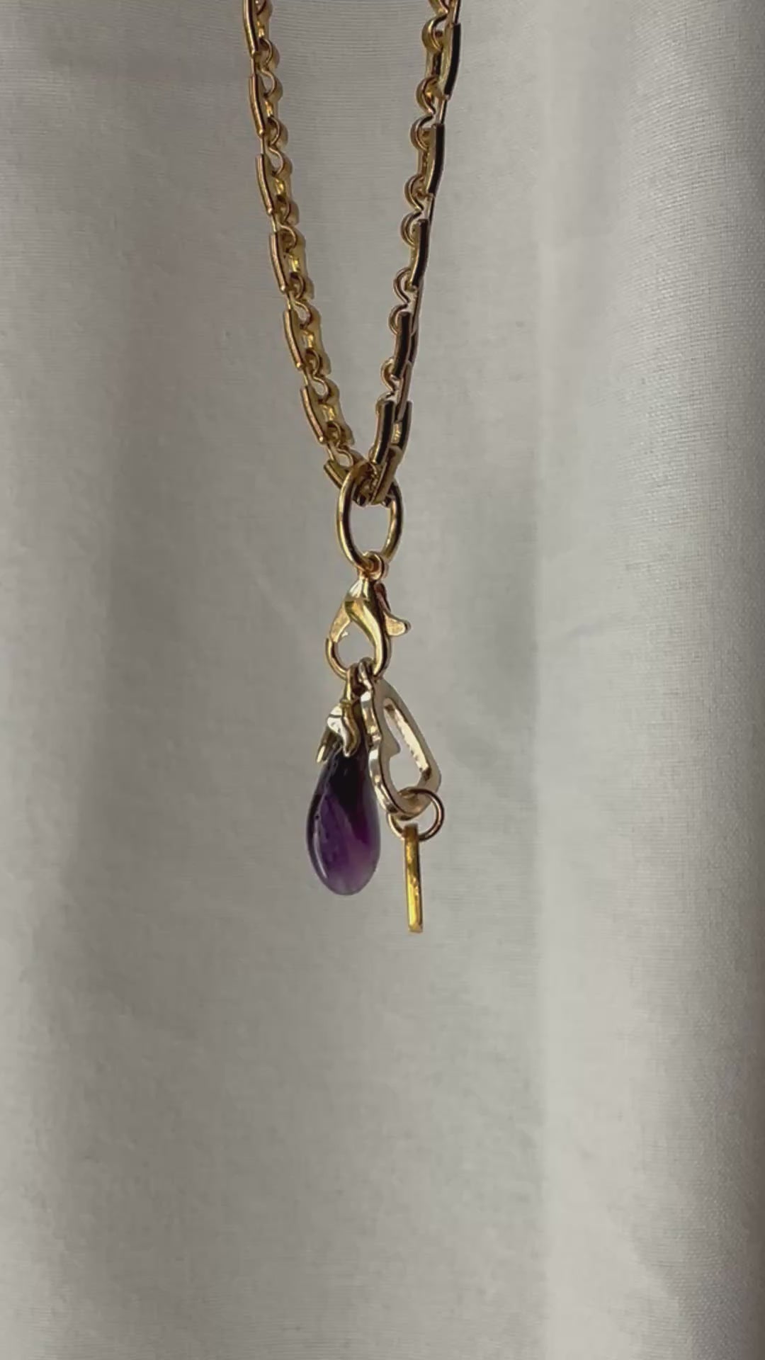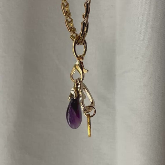 One-of-a-kind jewellery for that special someone. Vintage gold tone necklace with refurbished gems attached with a lobster claw fastening. The etched heart and purple gemstone charms are joined by a Regilt tab.