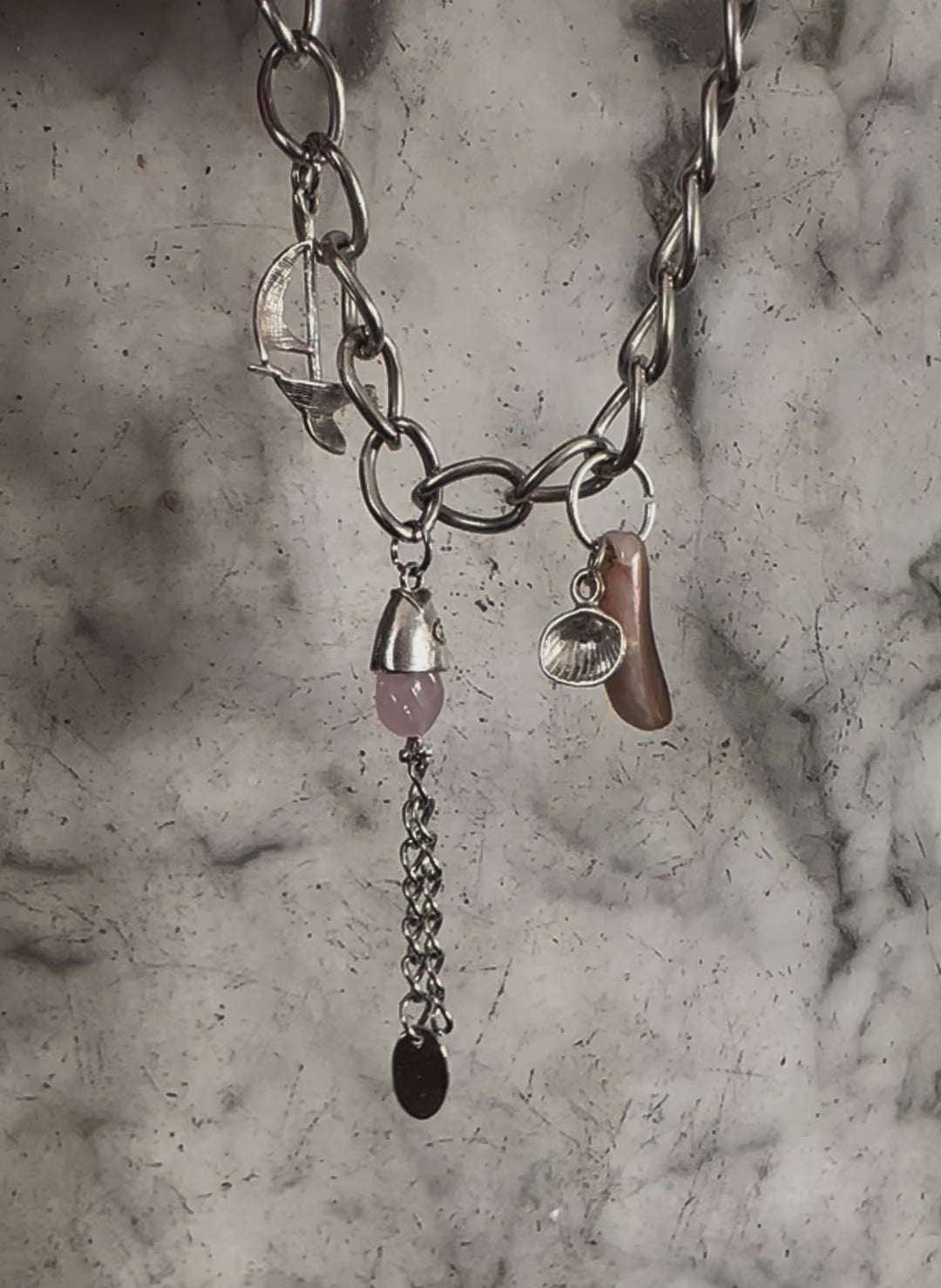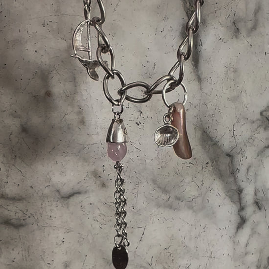 One-of-a-kind silver T-bar bracelet with a curated collection of maritime charms. Vintage mother of pearl nugget charm, Sterling silver ship, seashell and chain tail fish. The T-bar design brings a contemporary edge to traditional charm bracelets, perfect for every-day and occasionwear. A style as unique as you.