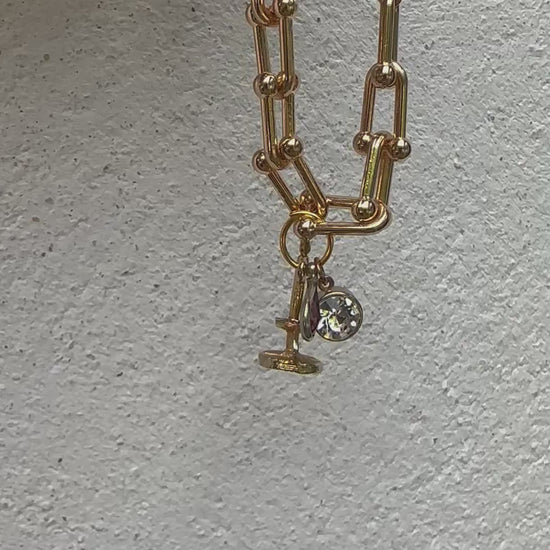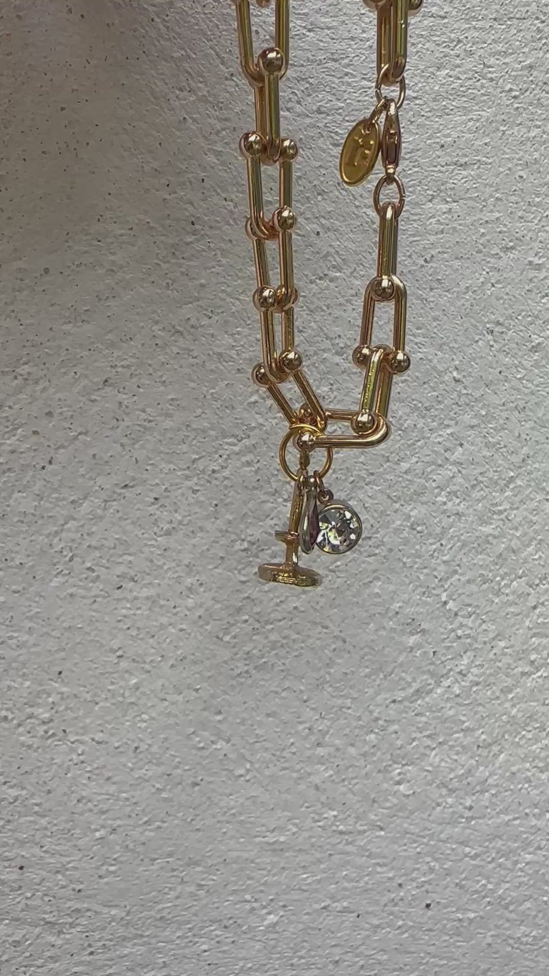 One-of-a-kind bracelet created from a collection of vintage gems. Gold-tone u-link bracelet is joined by a selection of charms including candlestick, teardrop gem and encased diamante. Finished with a Regilt tab, this unique charm bracelet is the perfect pick-me-up for every occasion.