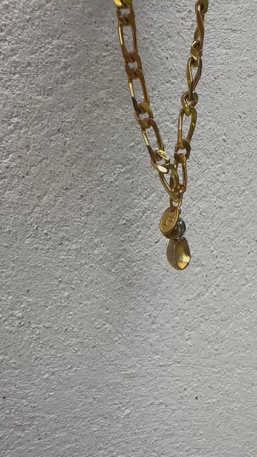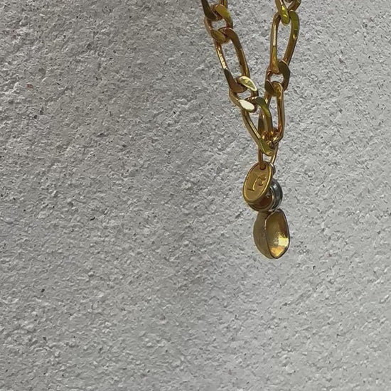 One-of-a-kind chunky charm bracelet with a cute curation of vintage charms. This bracelet features a trio of charms including gold tone ladle, amber encased gem and Regilt tab. Suitable for the everyday and special occasions, this is a new heirloom piece to treasure always.