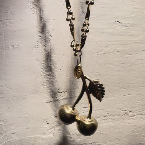 SOLD The last cherry pendant from a wonderful estate sale find, this has been the charm of the season for us. This design features a unique vintage link necklace with our Regilt tab. One of a kind piece for all your tomorrow’s.
