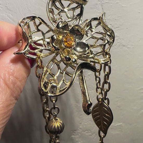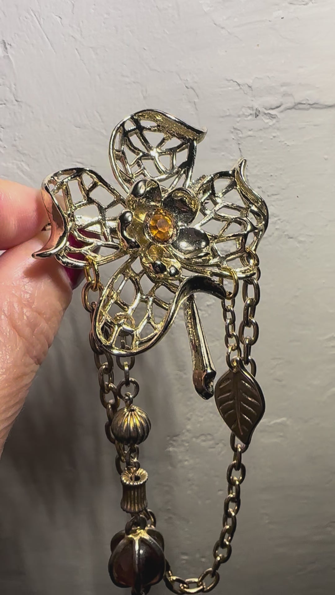 Vintage flower brooch with a one-of-a-kind charm curation including leaf and encased gems. Finished with a Regilt tab.