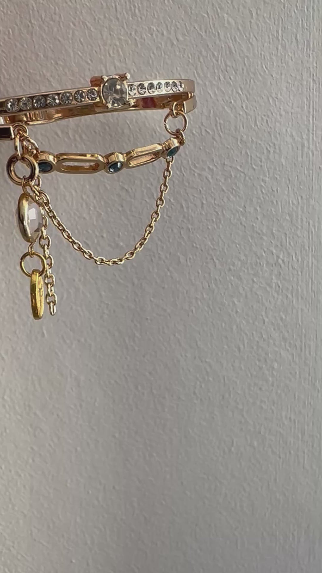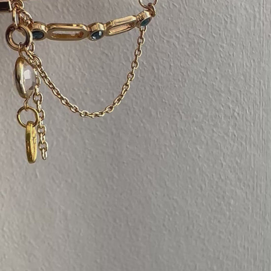 One-of-a-kind vintage bracelet with a layered drop design. This gold coloured bangle has a double hinged opening and diamanté design to top section. Below the diamantés hang a curation of vintage gems including blue tone bar trio, chain dangles and an encased faceted gemstone. Finished with a Regilt tab.
