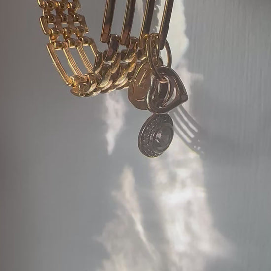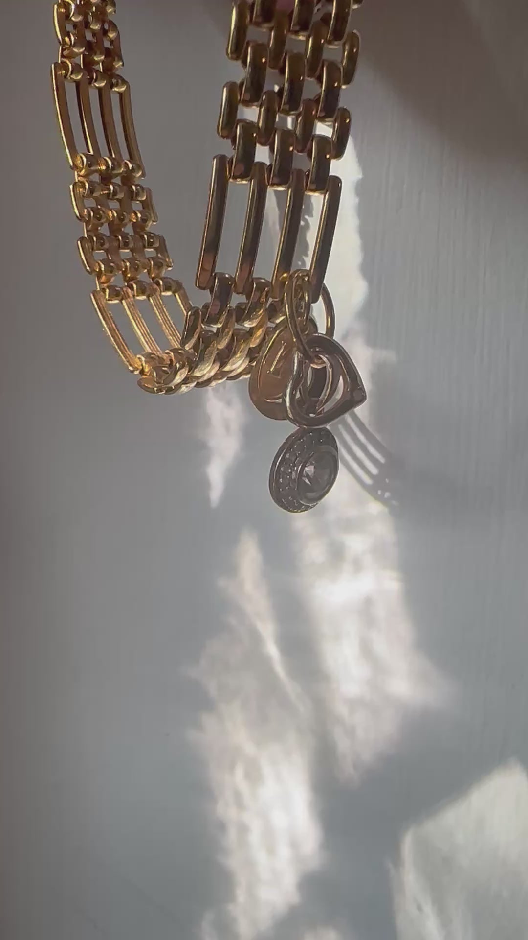SOLD This classic design gate bracelet has been reworked with a curated collection of vintage charms. Suitable for both casual and dressier days, charms include heart and pendant with diamante gems and circular gold dangle. A Regilt tab completes this contemporary heirloom piece.