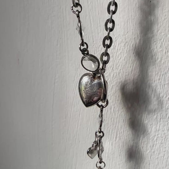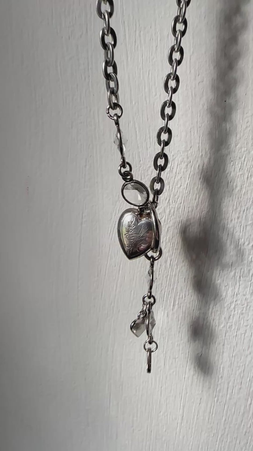 Part of our Endless Love Collection, this unique necklace combines vintage charms in a modern aethetic. Longer length oval link necklace has a lobster fastening to back, but can also slip easily over the head for trouble free styling. Embezzled gems are inserted into the necklace and also hang from a circular ring, joined by mini heart and Regilt fob. Larger sterling silver charm nestles in the centre of the necklace and has a delicate bird engraving. A contemporary heirloom for your forever favourite.