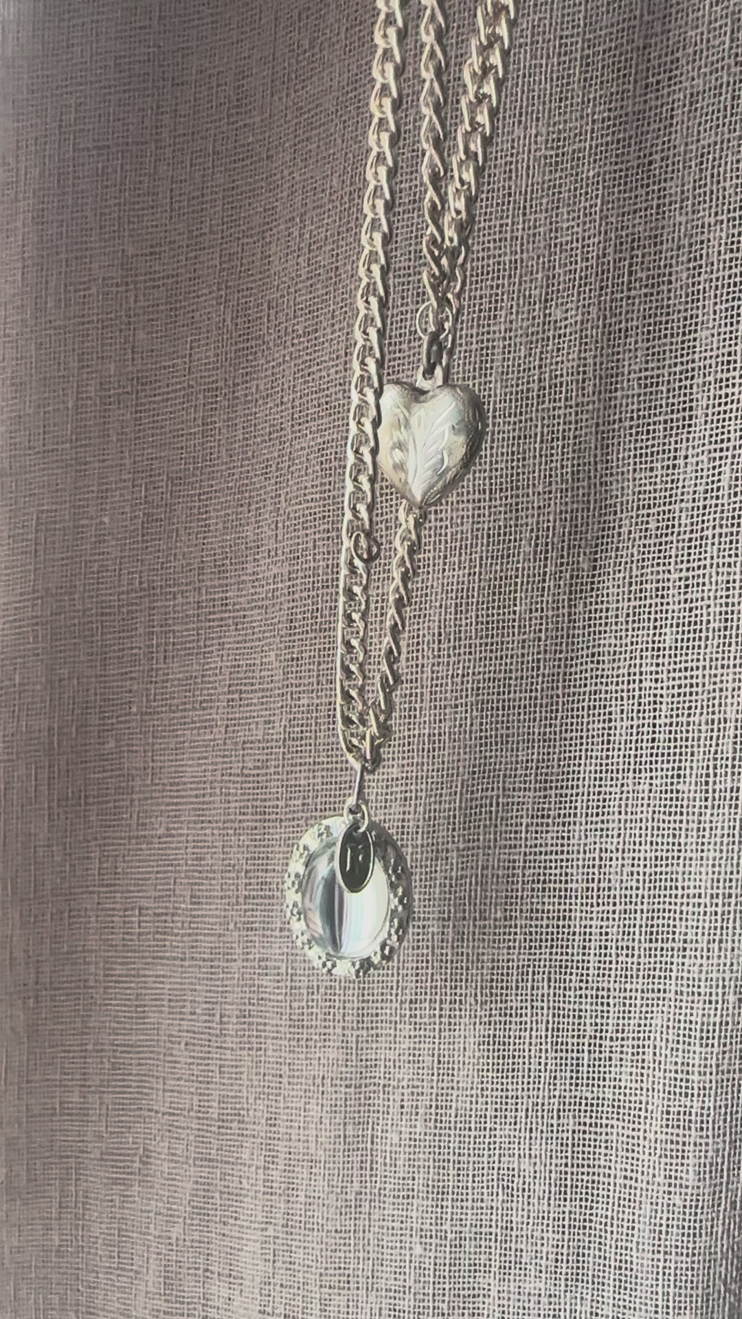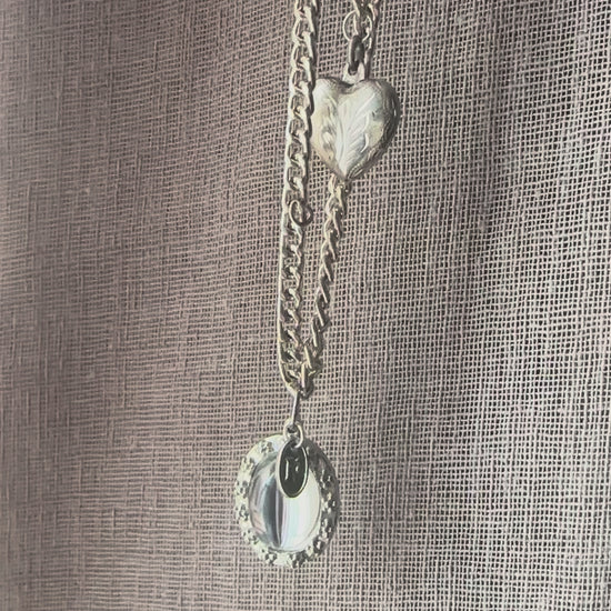 One-of-a-kind upcycled necklace to celebrate all that is love. Starting with a single chain, this links to a double layered chain style for a contemporary look. Two vintage charms include an etched sterling silver opening locket and a mid-century glass pendant with subtle floral surround. Finished with a Regilt tab.