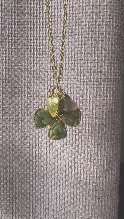 SOLD One-of-a-kind necklace featuring a unique curation of jewels of different vintage. Long belcher chain with mid century clover pendant with jade chips. Gold plated embossed heart opening locket, vintage gemstone and Regilt tab. One for lovers, dreamers and hopers to carry with them always.