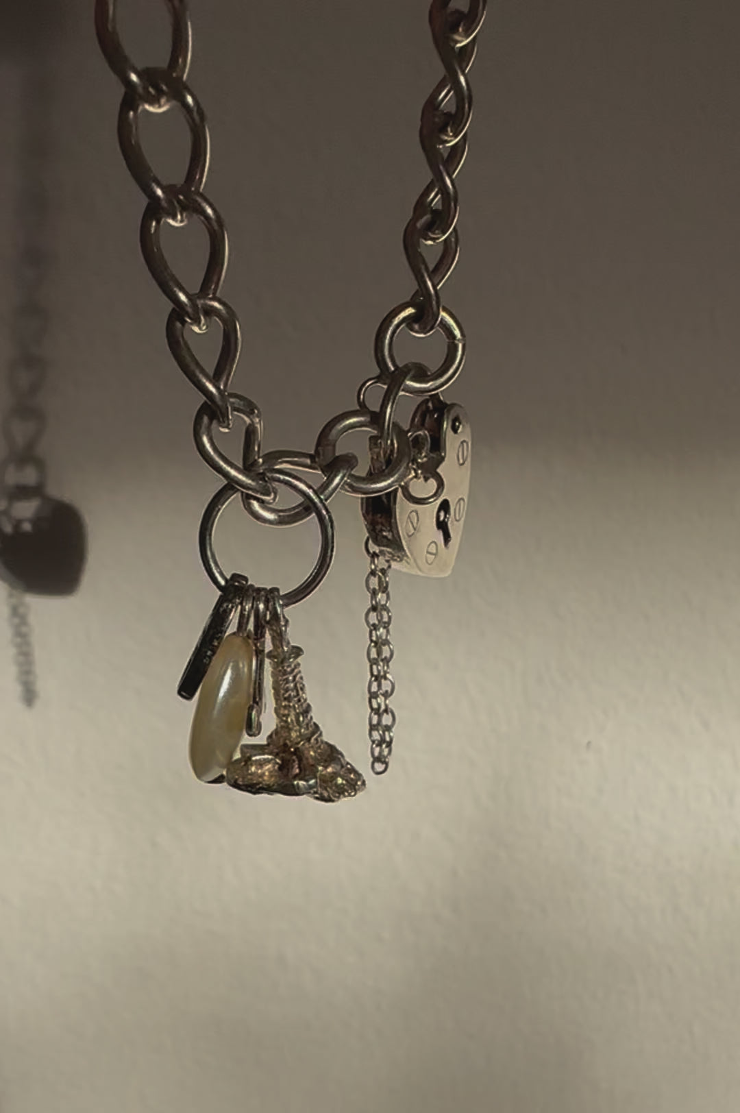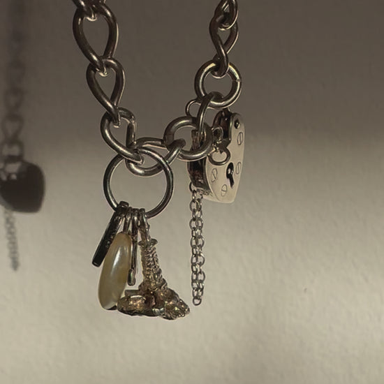 One-of-a-kind bracelet to celebrate that special someone. Sterling silver charm bracelet with classic heart lock fastening is a timeless style which suits both casual and dressier looks. The cluster of charms are sourced from different eras and include a sterling silver lighthouse, sterling silver anchor and faux pearl droplet. Finished with a Regilt tab.
