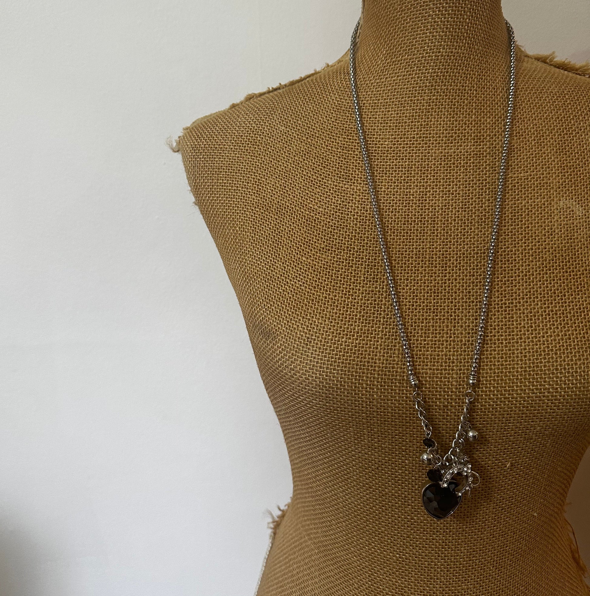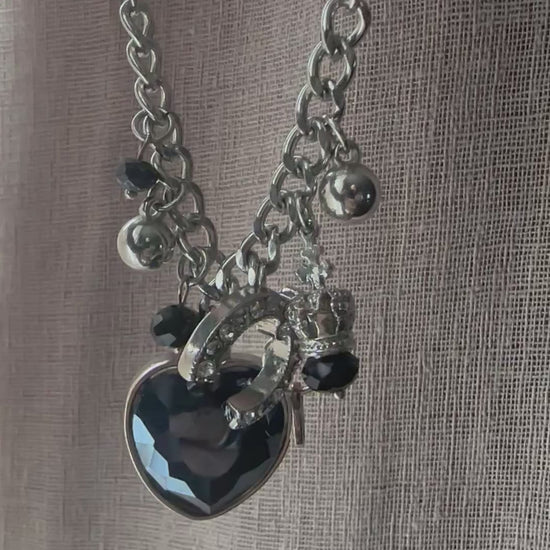 One-of-a-kind necklace made from a unique curation of vintage finds. This longer length design fits over the head and features two complimentary chains for a contemporary look. Charms in black and silver colour tones include lucky horseshoe, encased heart, crowned bead, silver balls and black faceted beads. A new modern heirloom to wear for every occasion.