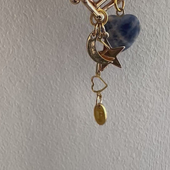 One-of-a-kind bracelet for that special someone. This gold tone bracelet has U chain links and a lobster clasp. A curation of vintage charms include a heart shape blue gemstone, star, moon, and a heart dangle chain. Finished with a Regilt tab.