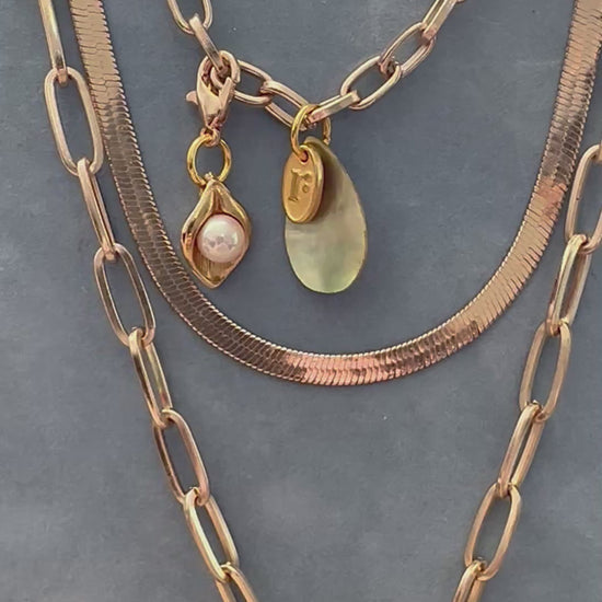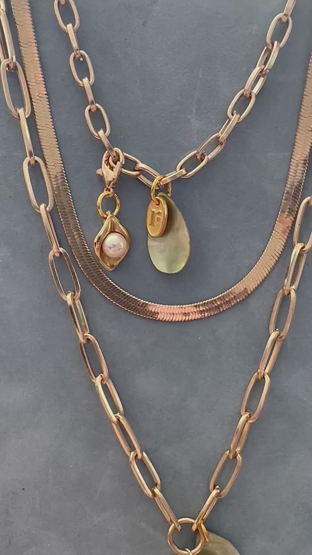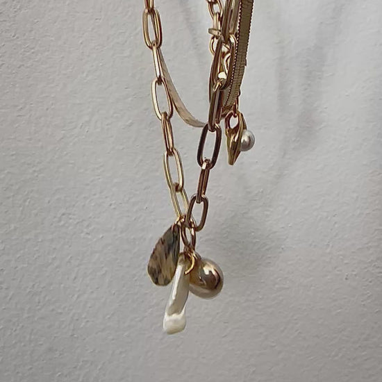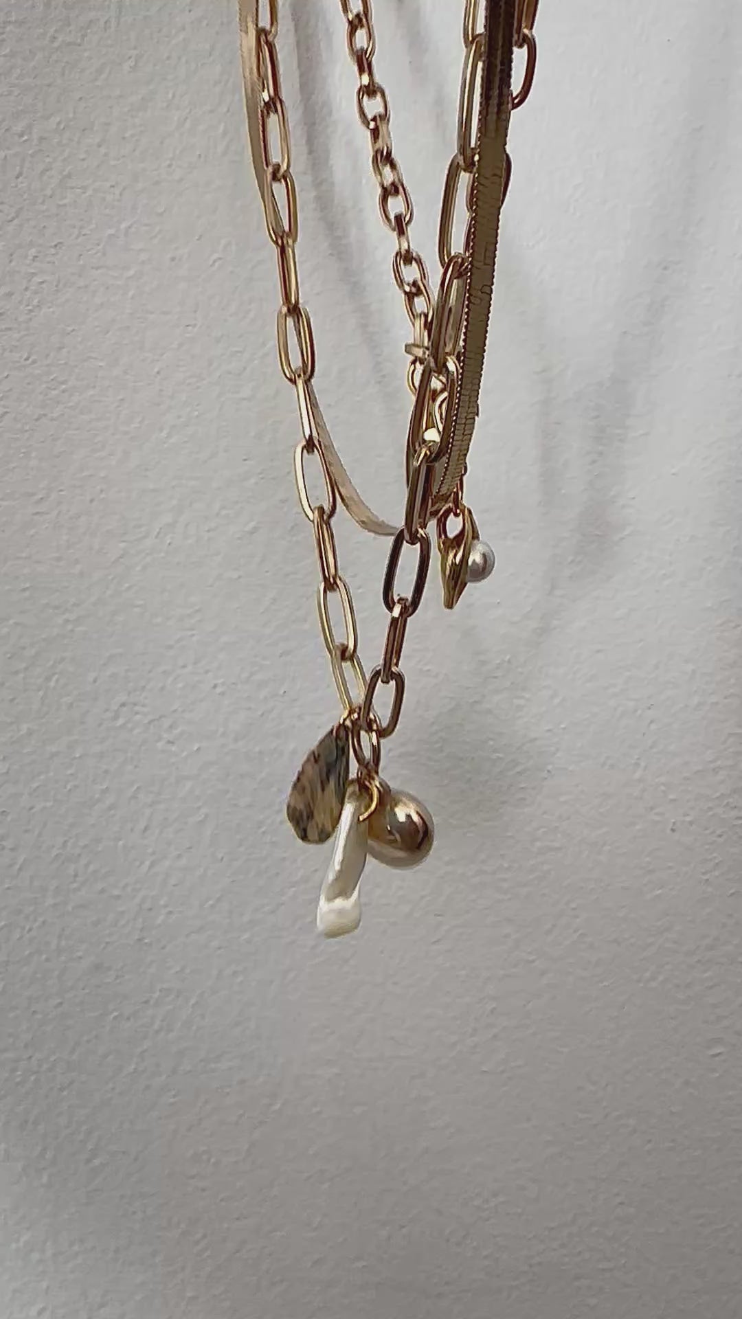 This one-of-a-kind design layers on the charms. Triple chain design reflects the stacked jewellery trend including mini and maxi oval link chains and midi snake chain. A curation of 5 vintage charms includes pearl shells , heart, mother of pearl nugget and encased gem. Finished with a Regilt tab.