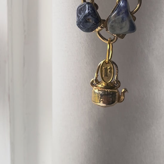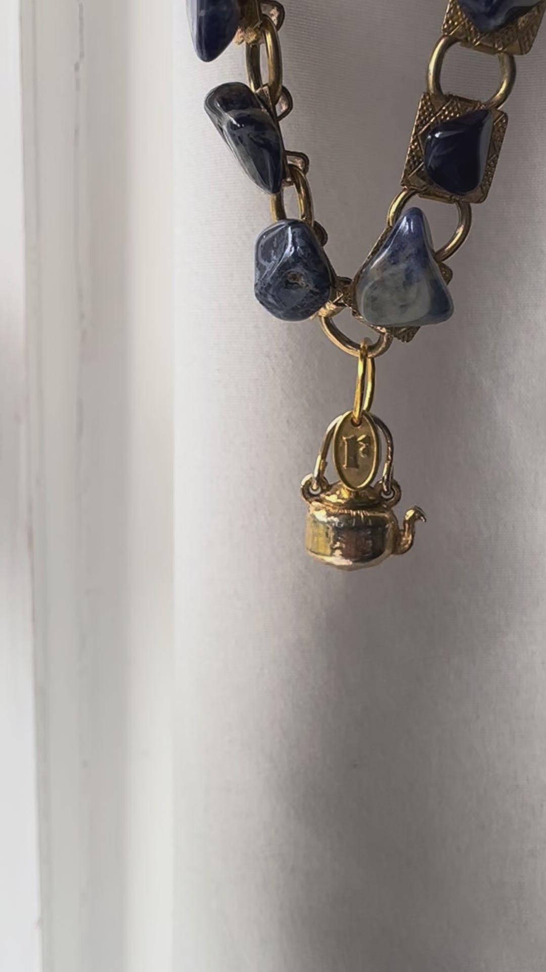 SOLD This unique bracelet is a one-off design created using vintage sourced pieces. The bracelet is of mid century vintage and features blue gemstones onto gold tone links. Golden kettle charm and Regilt tab complete the look.