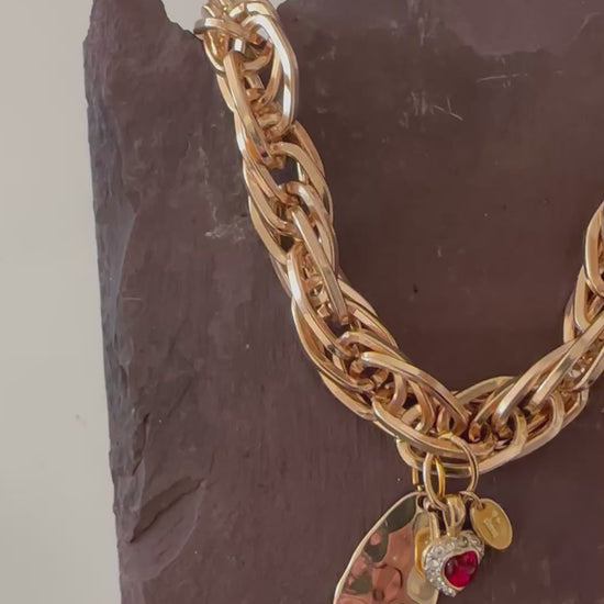 This one-of-a-kind charm necklace is designed for both casual and dressier occasions. The choker length necklace has an extender chain to allow for a more loose fit and also enables this piece to be worn as a double wrapped bracelet! A trio of vintage charms include a mid century diamanté and red stone heart, an encased teardrop gemstone and a hammered golden leaf. Regilt tab completes the look.