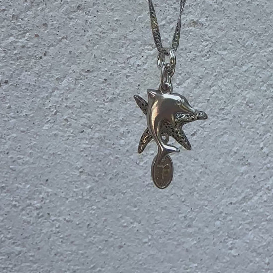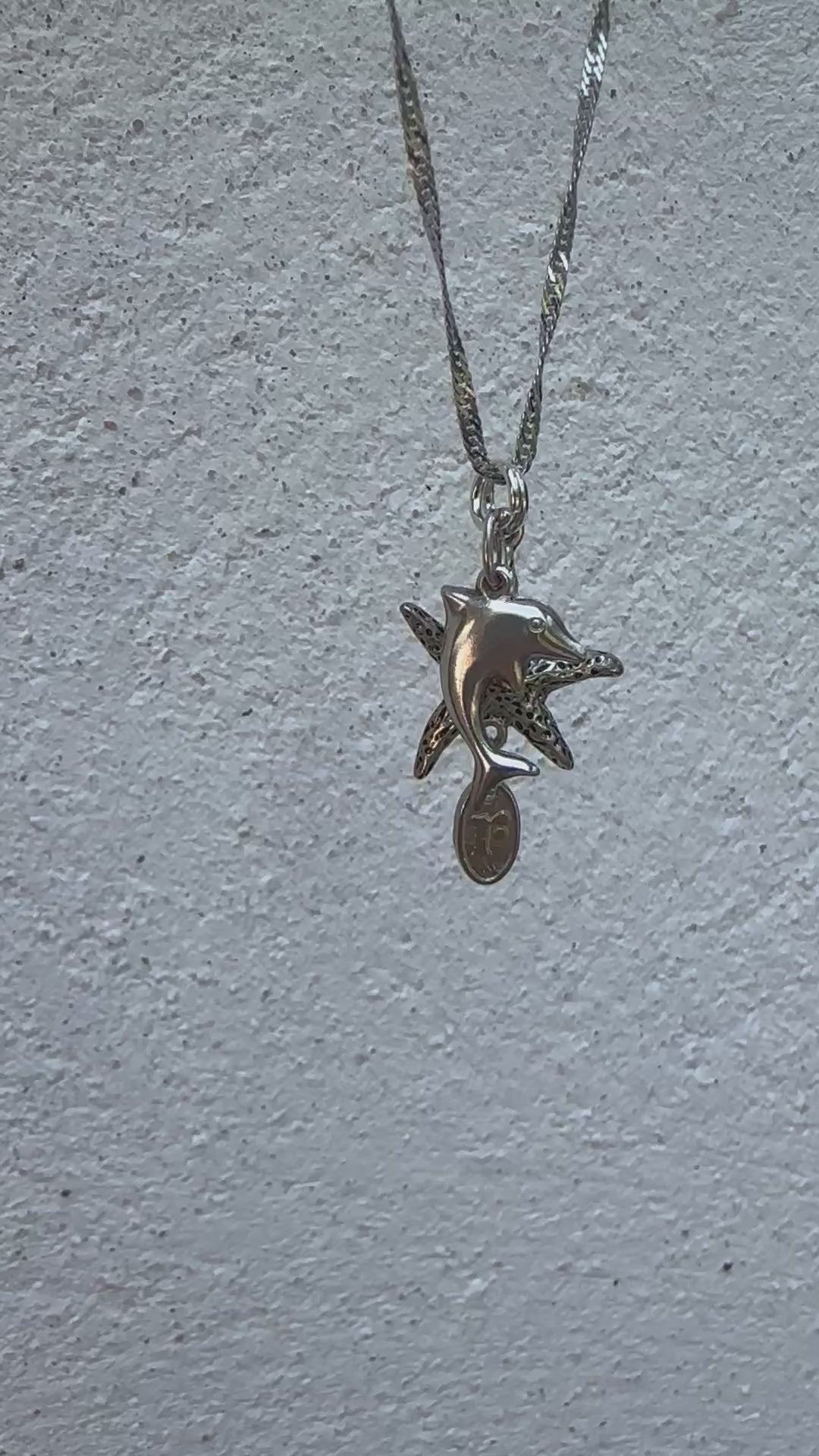 Silver charm necklace created from a curation of sea themed charms, reimagined for contemporary wardrobes. This sterling silver stamped twisted rope design necklace has a charming trio of charms including silver dolphin, starfish and Regilt tab. One-off piece for that special someone.