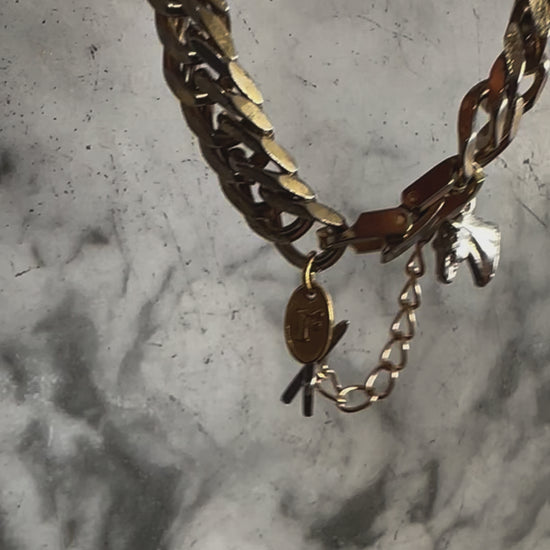 SOLD One-of-a-kind bracelet curated from vintage treasures. The chunky chain link bracelet is a timeless style which suits both casual and more dressy looks. The two sterling silver charms are a horse head and skis, inspiring the Show Jumper name! Safety chain and Regilt tab complete the look. This is a longer length bracelet, still suitable for all as it works well worn stacked or draped on smaller wrists.