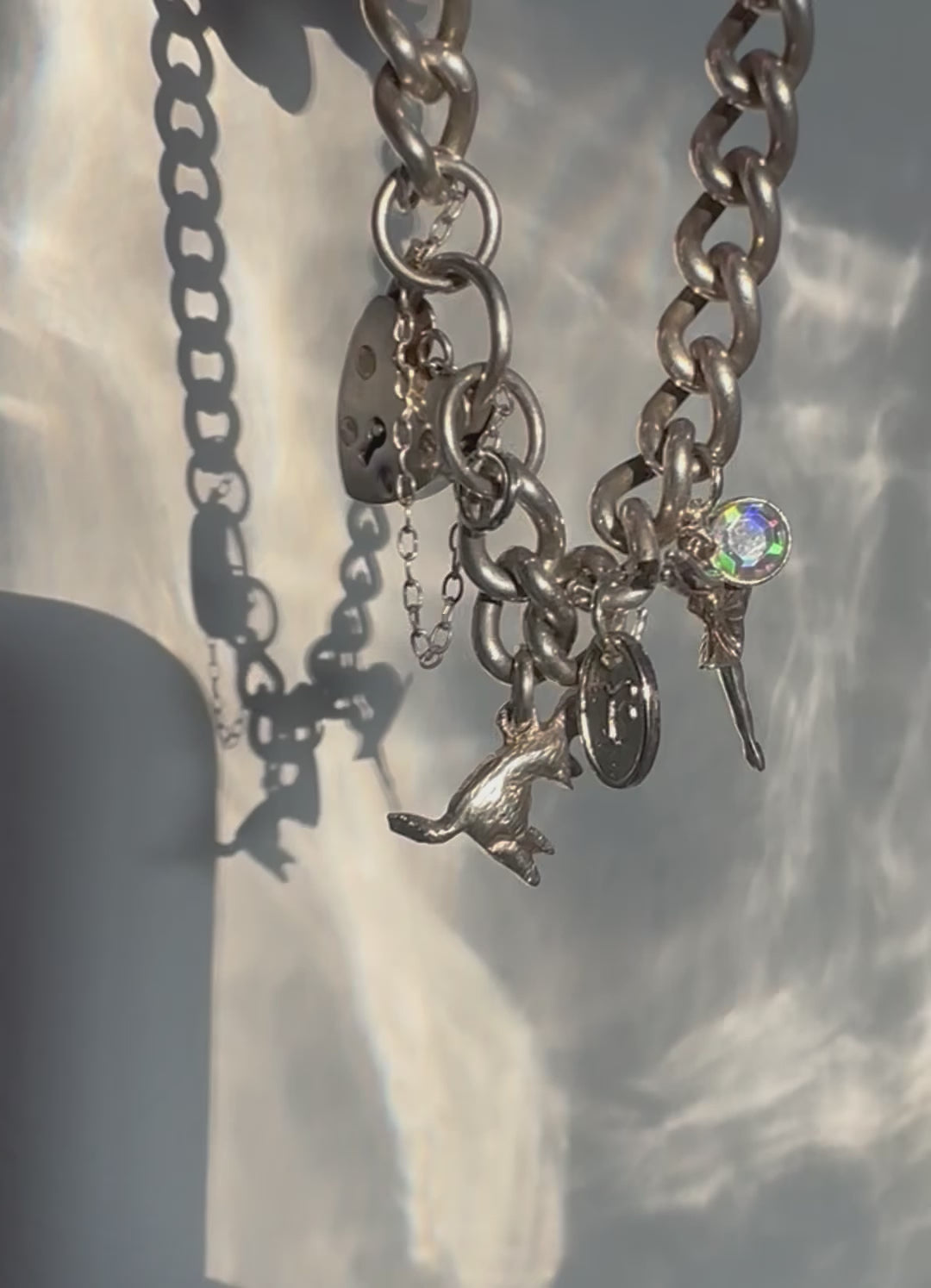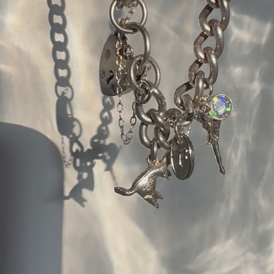 One-of-a-kind vintage bracelet with curated charms. This chunky chain charm bracelet is a timeless design with iconic heart lock clasp and safety chain. The bracelet is hallmarked silver and can be worn for every day and more formal occasions. Three charms from different eras include sterling silver ballerina, sterling silver kangaroo and faceted glass drop mini pendant. An heirloom piece to treasure. Regilt tab completes the look