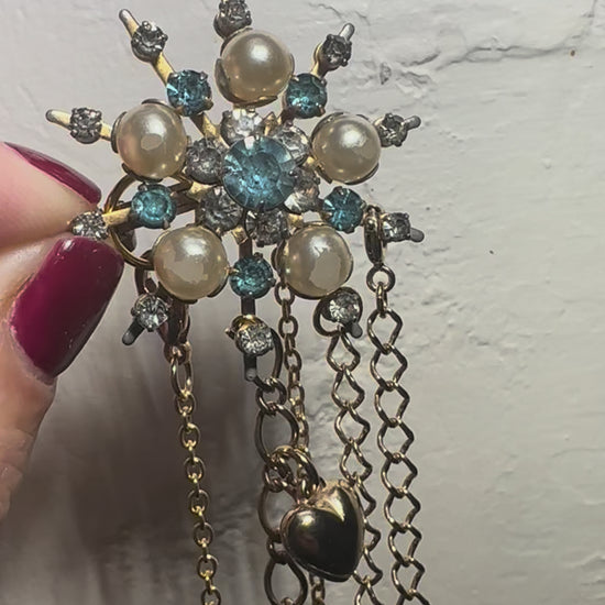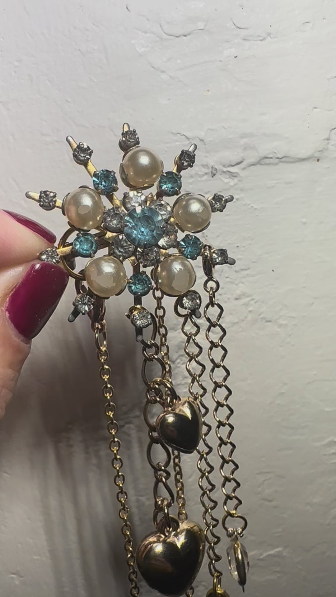 Vintage starburst brooch with a one-of-a-kind charm curation in blue tones. Finished with a Regilt tab.