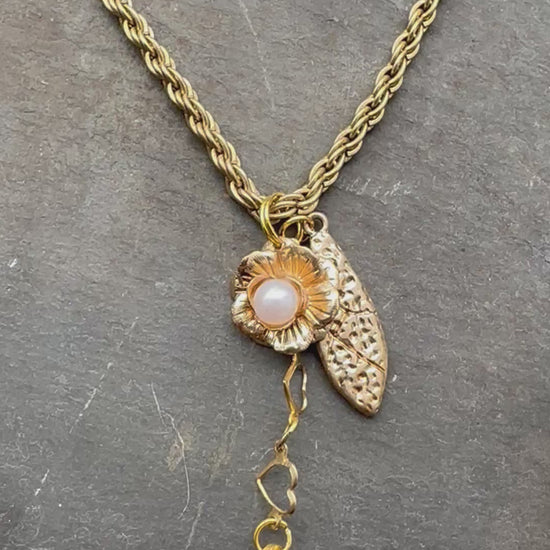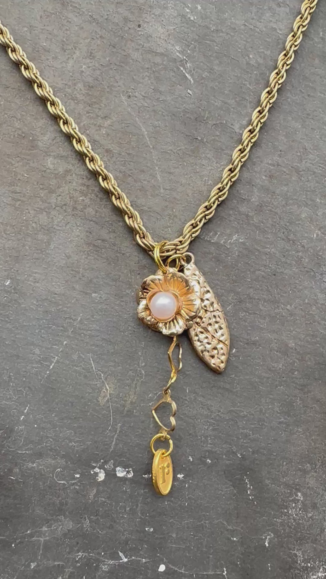 One of a kind charm necklace for that special someone. Rope design chain is a classic style which suits both causal and more dressy events. A unique curation of vintage charms includes encased pearlescent gem flower, mid century leaf and a triple heart chain. Finished with a Regilt tab.