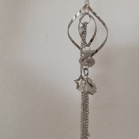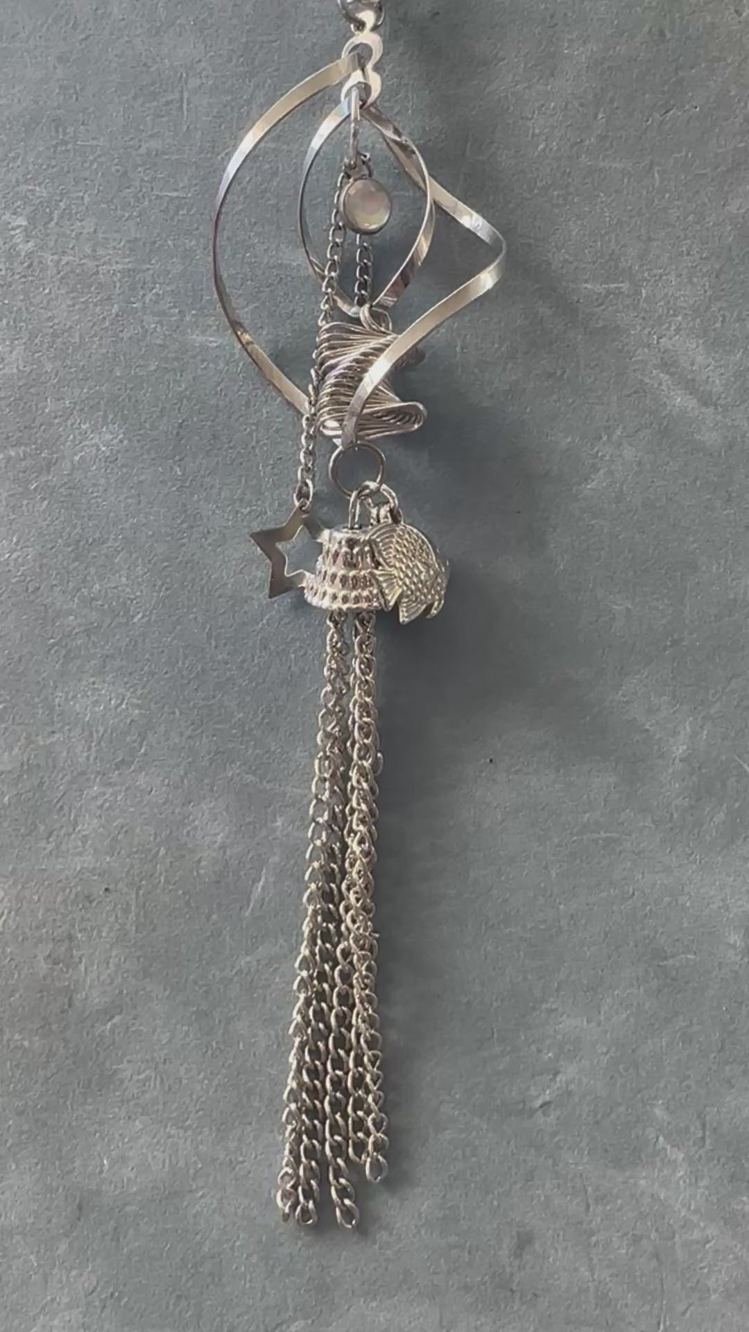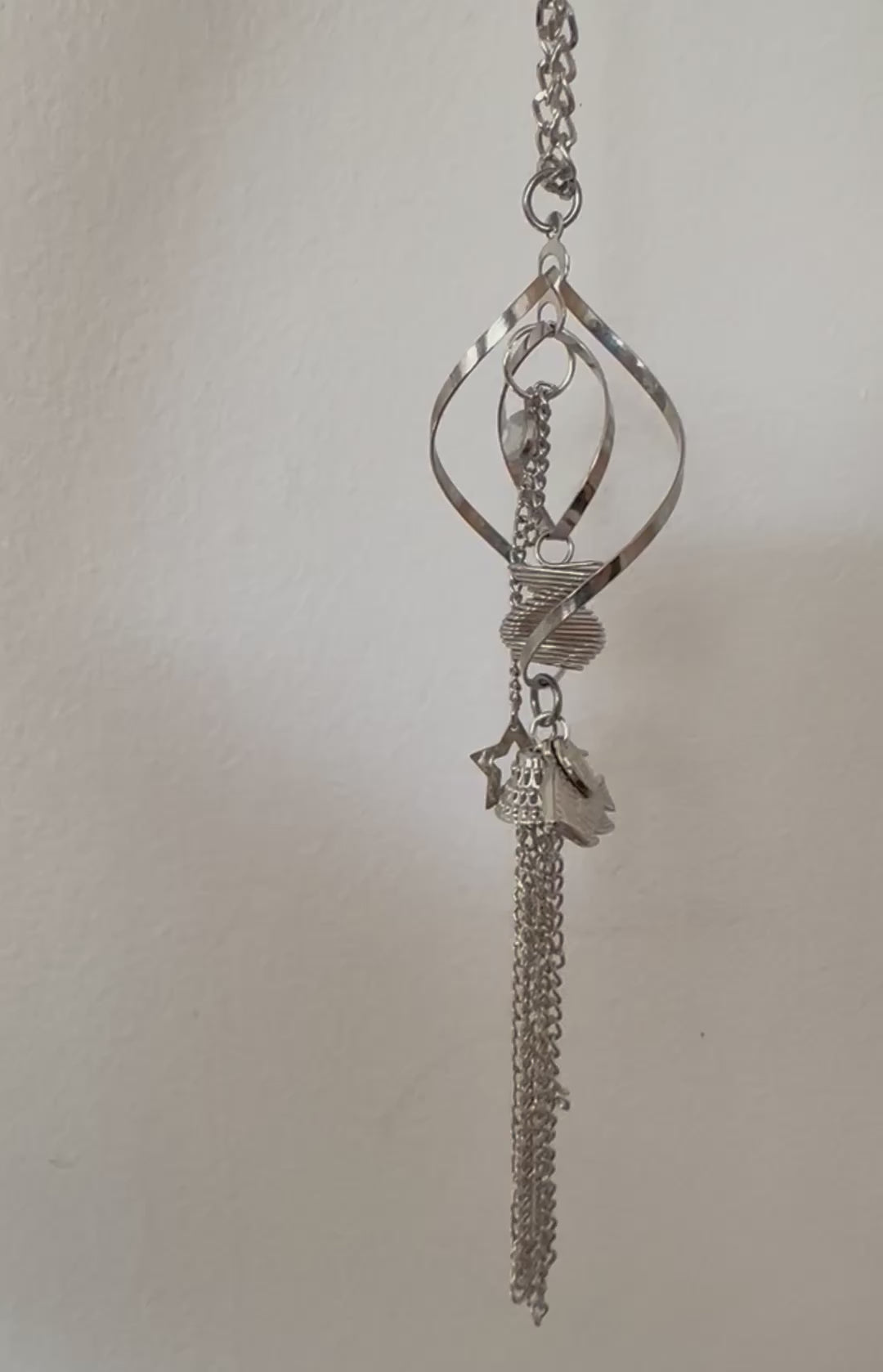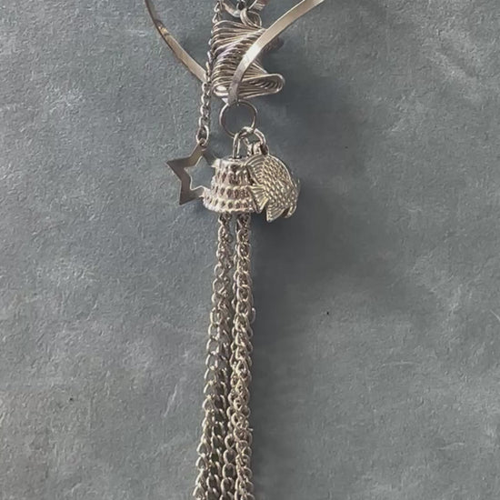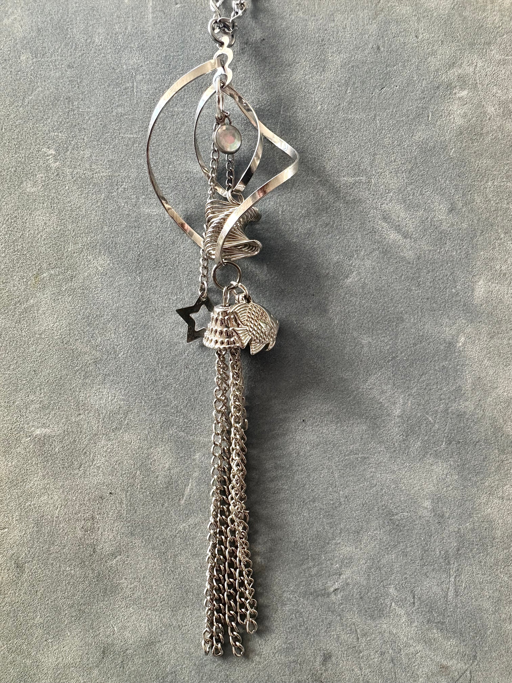 One-of-a-kind necklace with a curation with a curation of vintage charms. This longer length design slips over the head for effortless style. Suitable for both casual and dressier events, this piece would make a unique gift for that special someone. Abstract swirl pendant has a smaller swirl hanging to centre. Additional charms include tassel chain, fish, dangle star and encased gem. Finished with a Regilt tab.