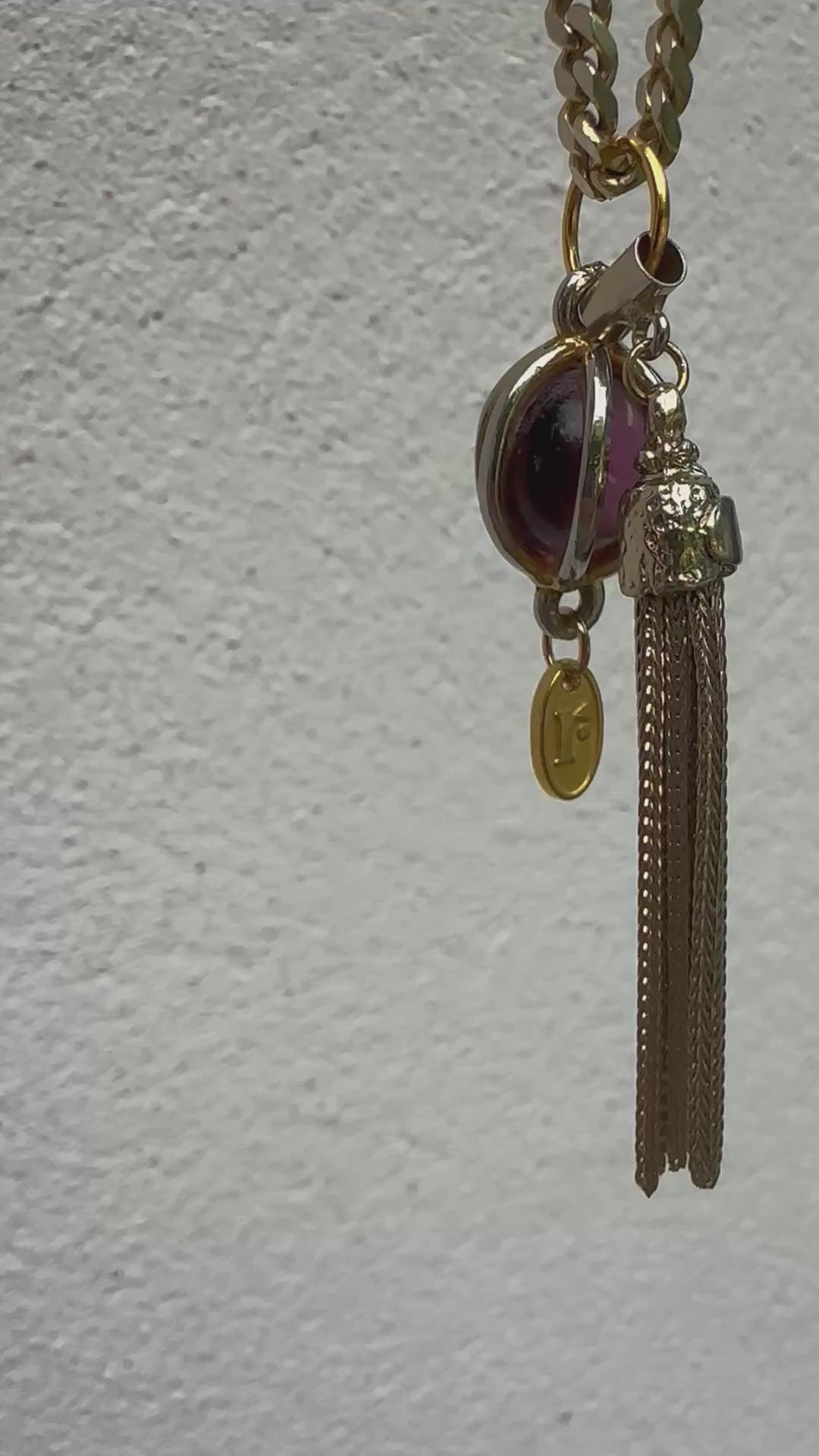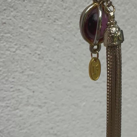 SOLD This one-of-a-kind design compliments both contemporary and classic styles. Chunky gold tone vintage chain has a trio of charms including Regilt tab, encased glass gem and golden dangle tassel. Tassels have featured in jewellery for centuries, associated with prosperity, protection and status. In various cultures they were used as good luck charms. Whatever your message, this necklace is a unique accessory for every day and special occasions.