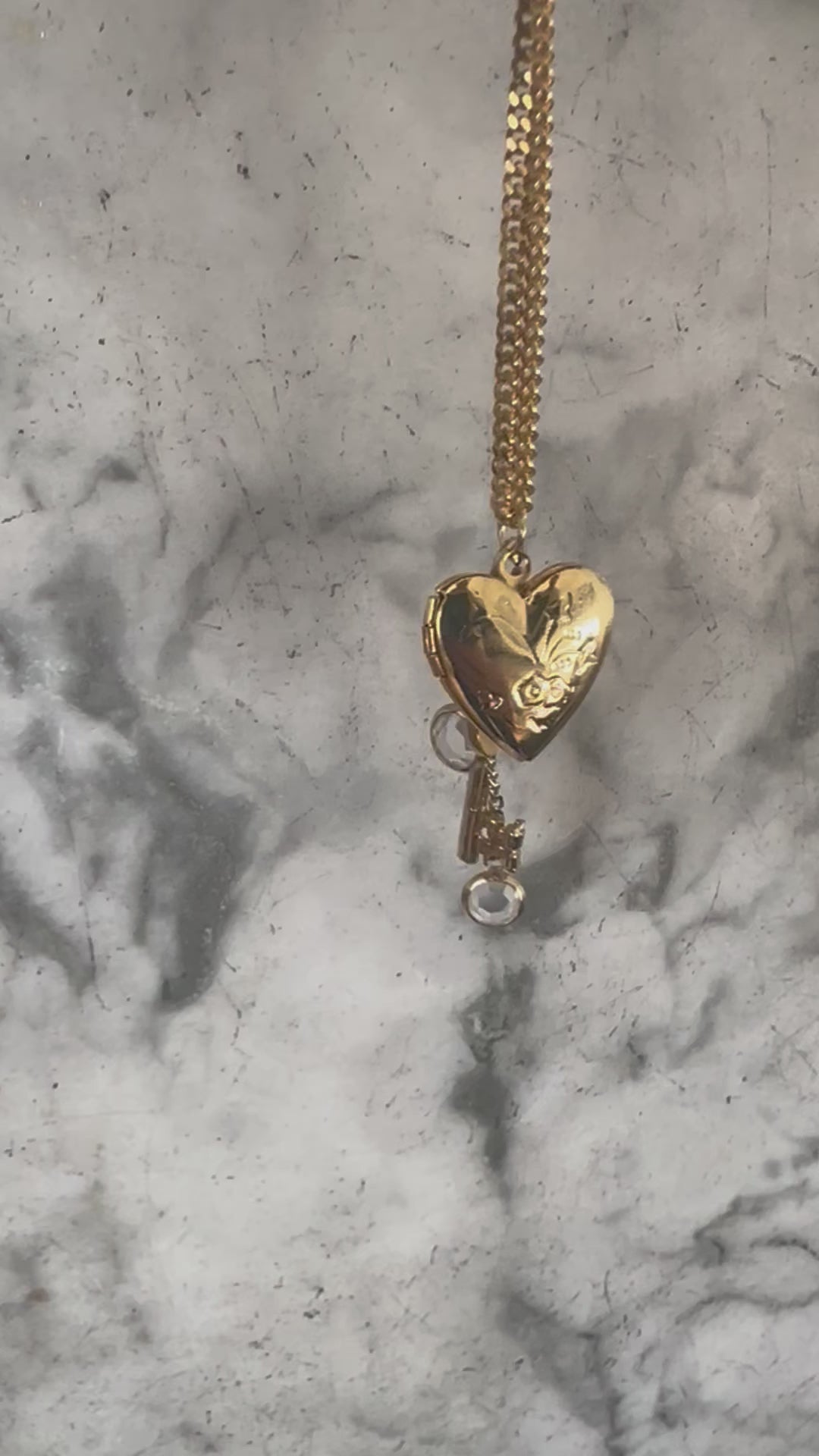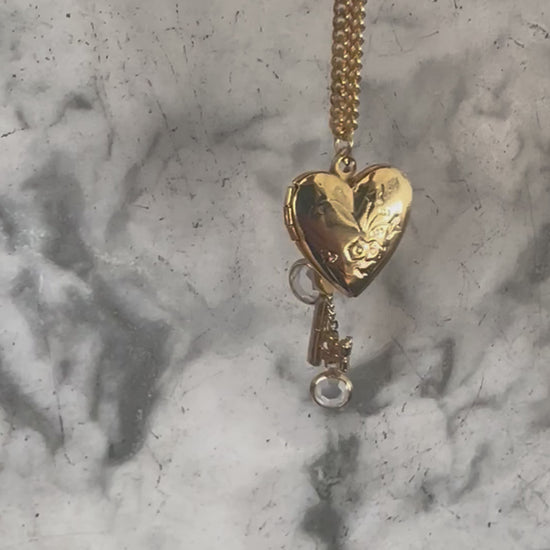 One-of-a-kind necklace to celebrate all that is love. A unique curation of vintage jewels on a gold tone chain including opening heart locket, key and faceted gems on dainty gold chains. A piece for special occasions and every day, because every day with those we love is a special occasion. Finished with a Regilt tab.