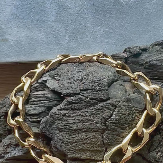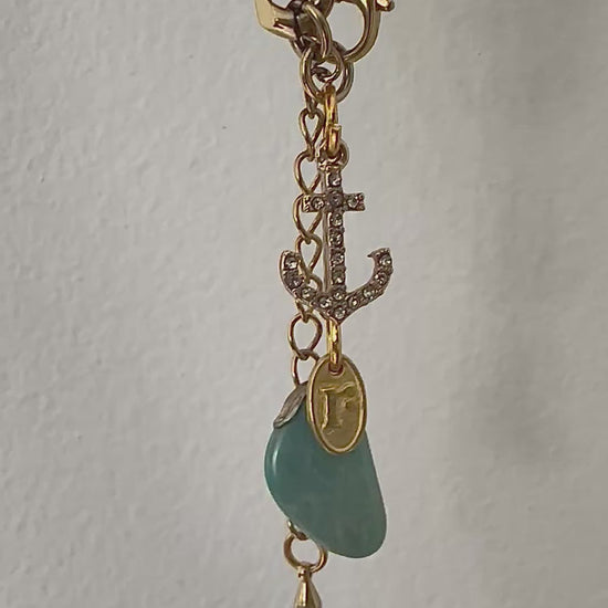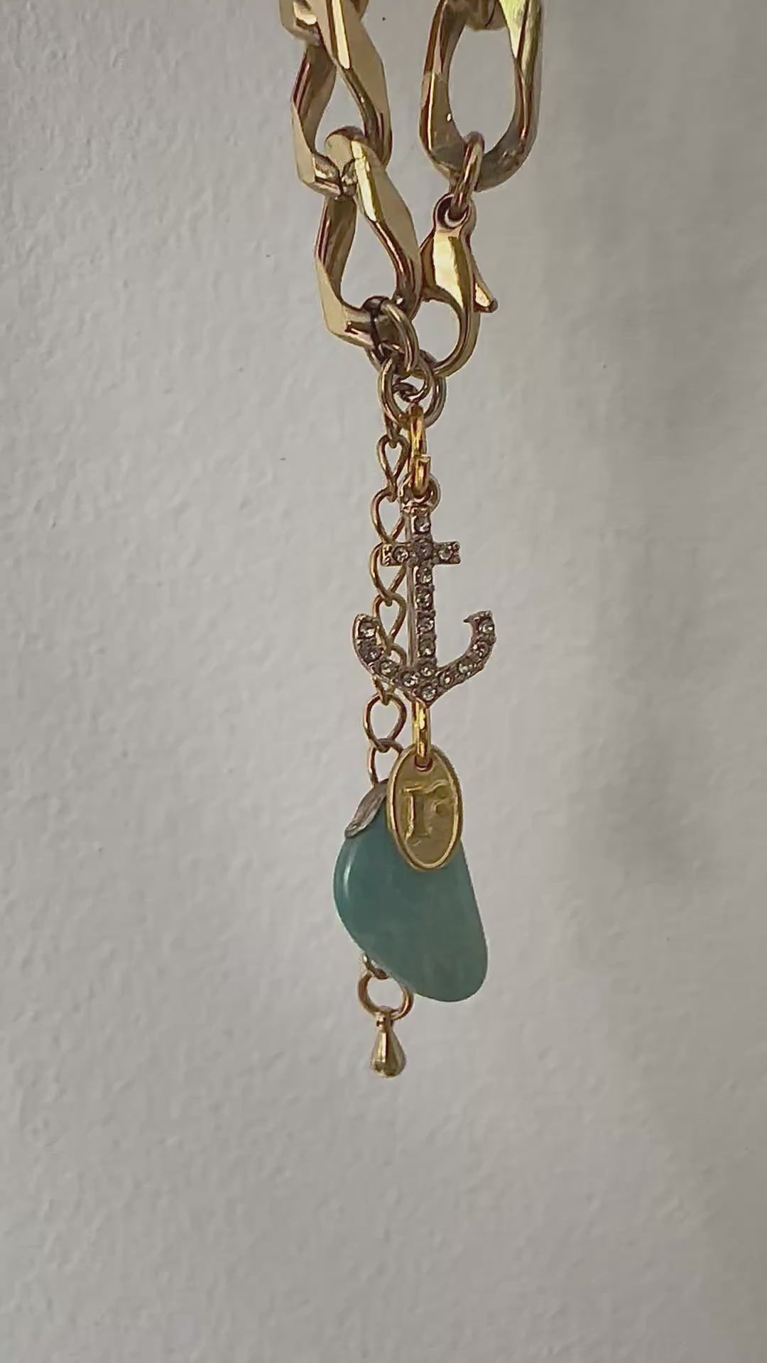 One-of-a-kind golden charm bracelet with curated charms. This chunky link bracelet is a timeless design which suits both casual and dressier outfits. Vintage charms include diamanté anchor and drop gemstone, finished with a Regilt tab.