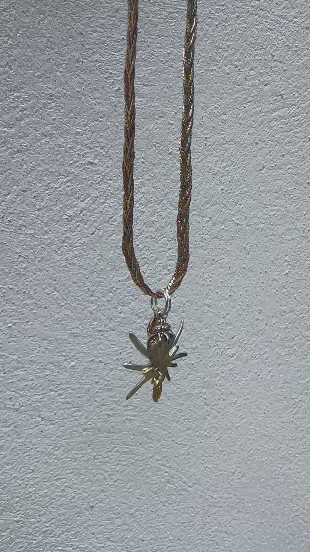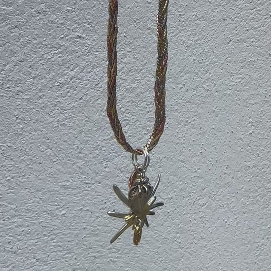 SOLD This unique piece is made from a curation of vintage finds which have been refurbished and reimagined. Tri colour necklace is in a plaited herringbone design, coordinating with the mix-tone charms which include starfish, fob and seashell. Finished with a Regilt tab.