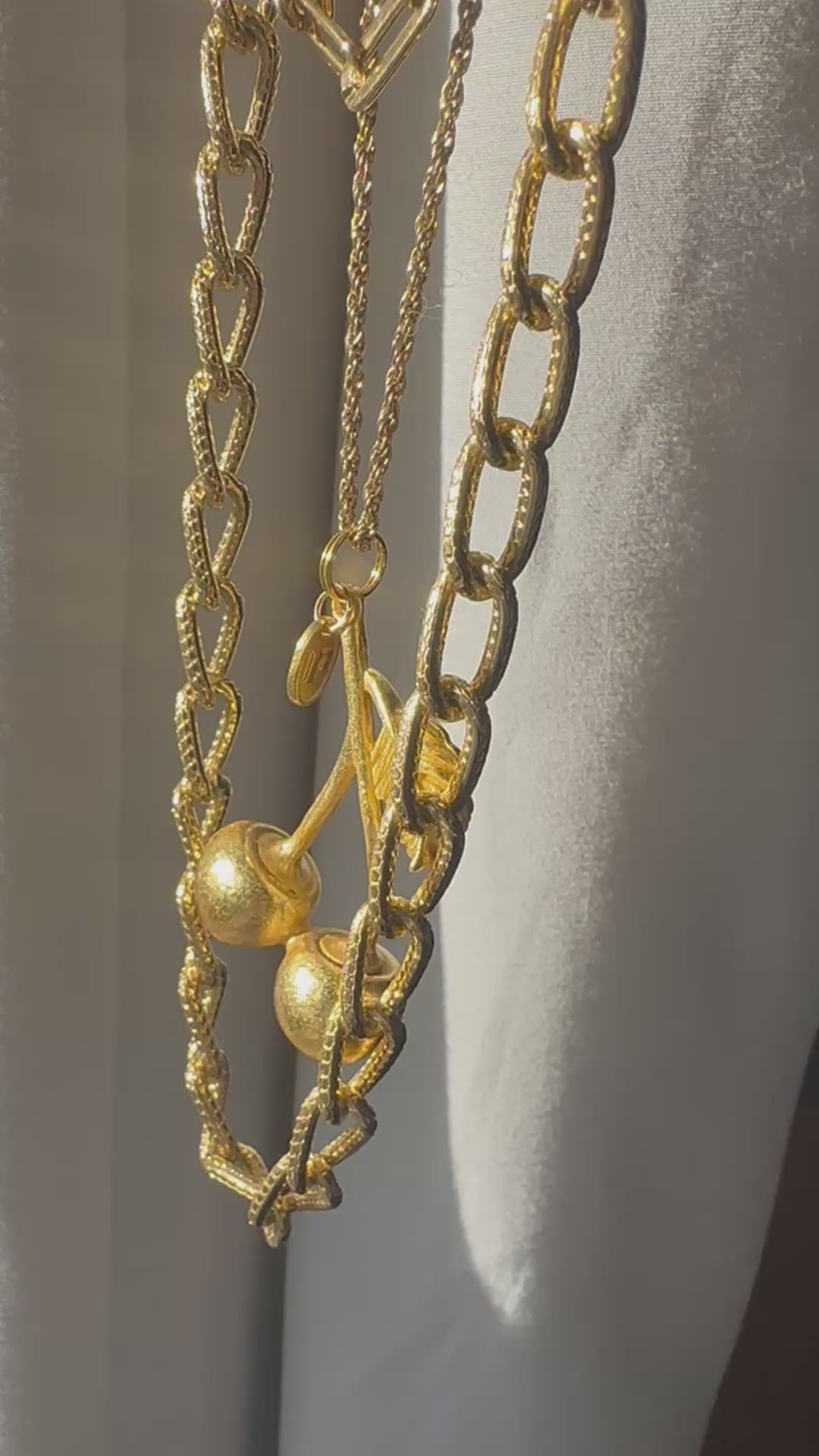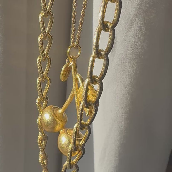 Triple layer charm necklace with yellow gold tone cherry pendant and Regilt tab. One of a kind piece to treasure always.