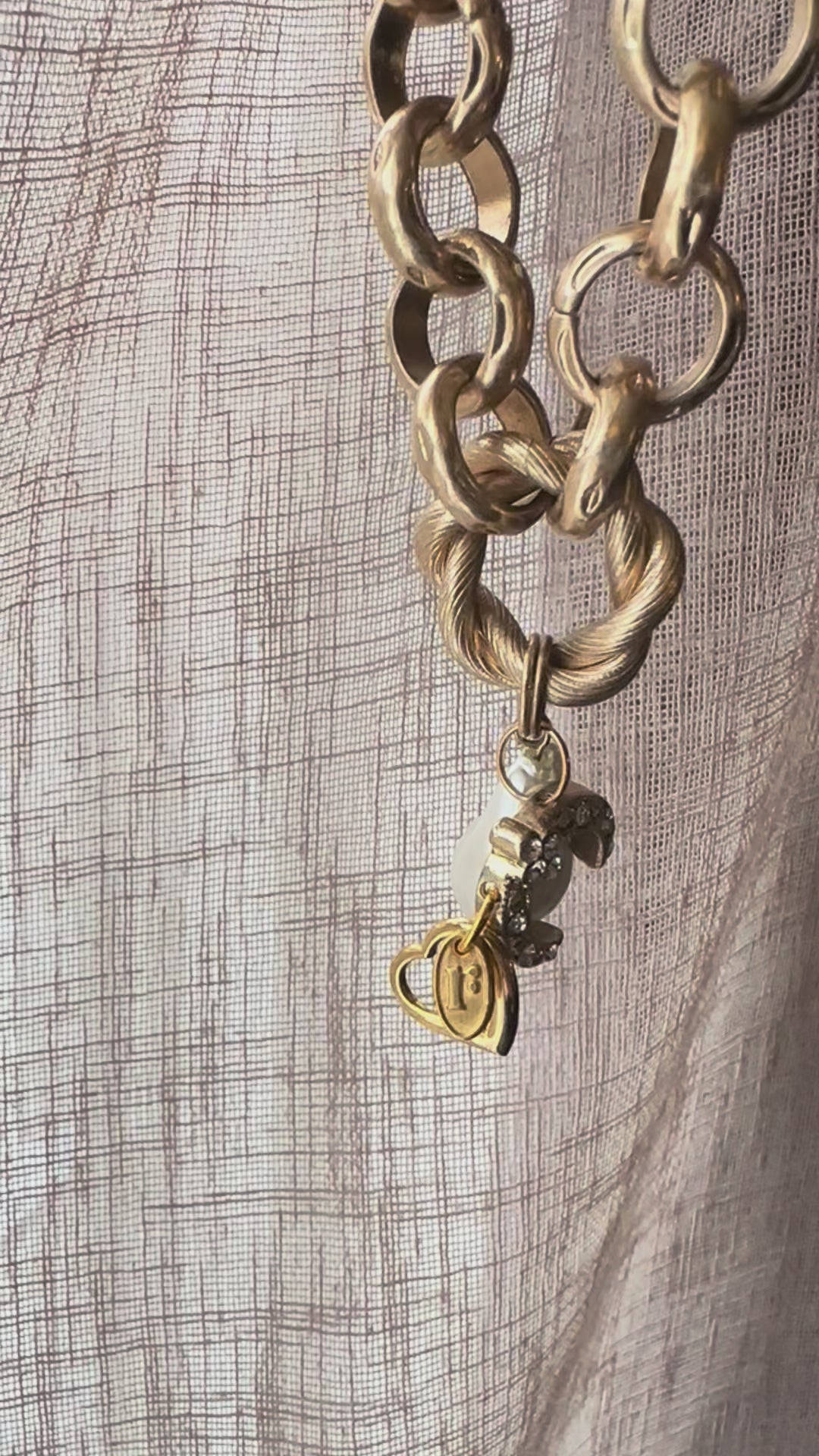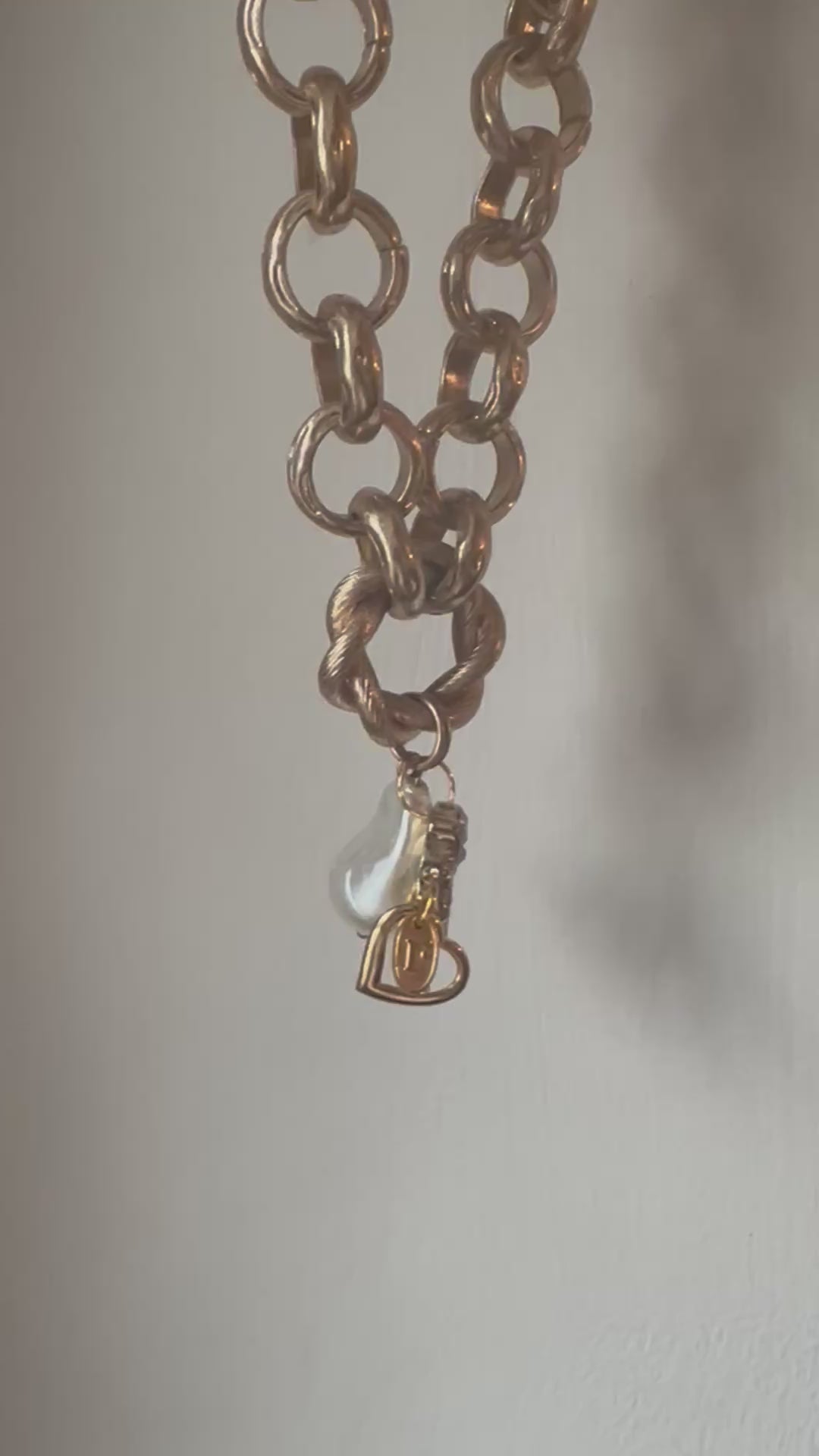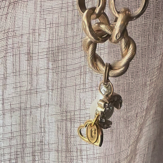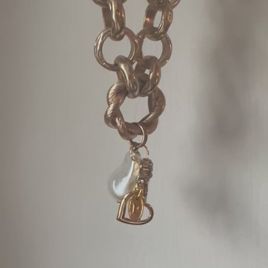 Mid century style chunky golden necklace with a conscious curation of vintage treasures. This necklace suits both casual days and more dressy events, perfect for today’s conscious consumer. Vintage charms include pearl nugget, diamanté lucky horseshoe and golden heart with tiny diamanté. Finished with a Regilt tab