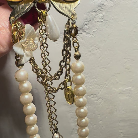 SOLD Vintage leaf brooch with a one-of-a-kind charm curation including pearl effect and leaf shapes. Finished with a Regilt tab.